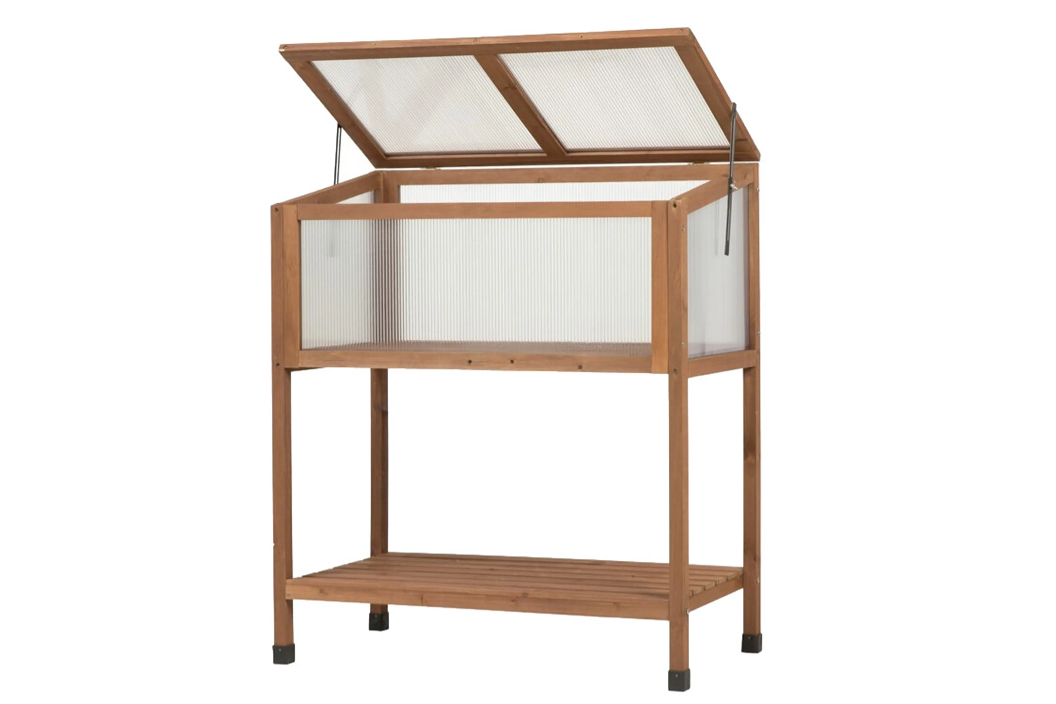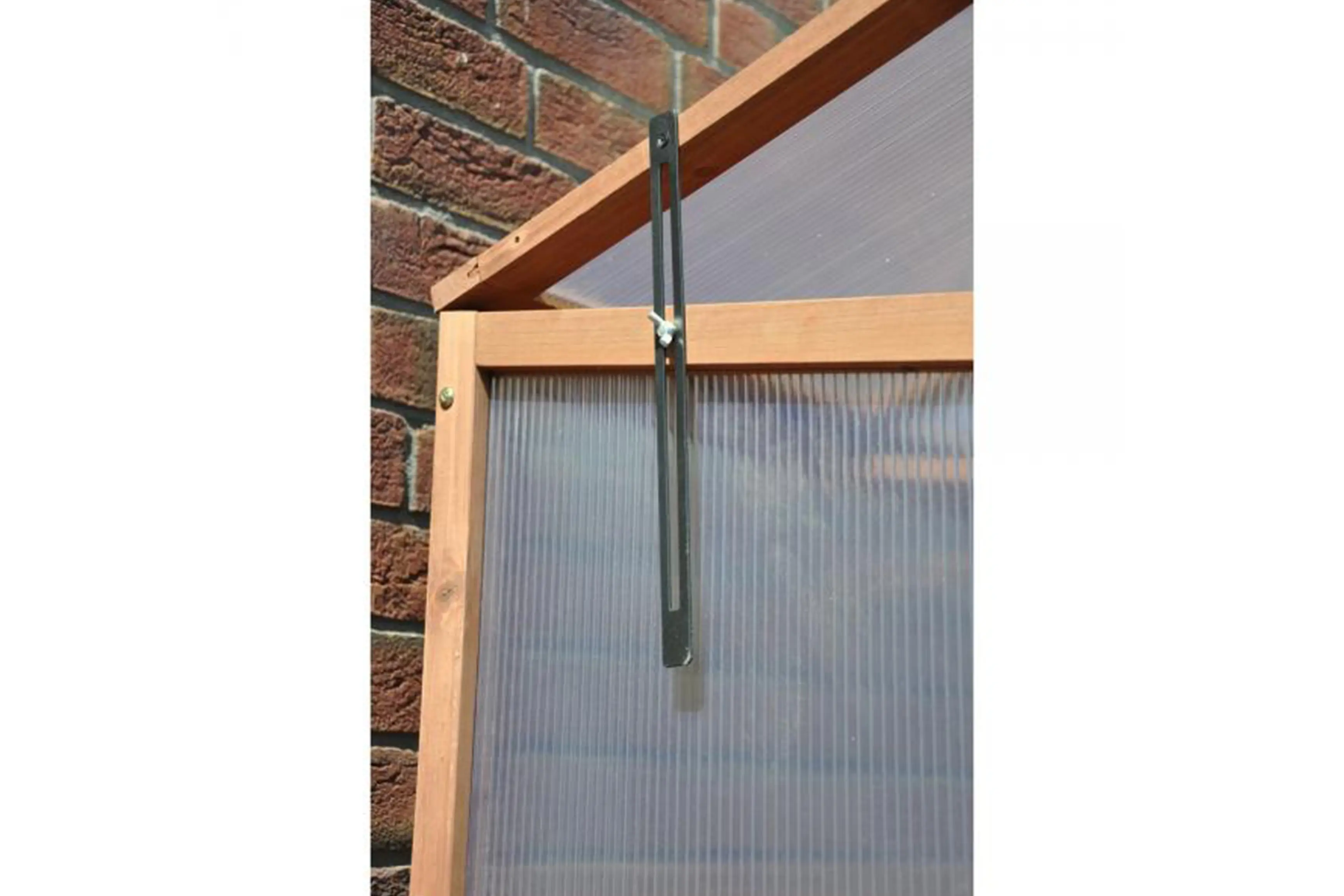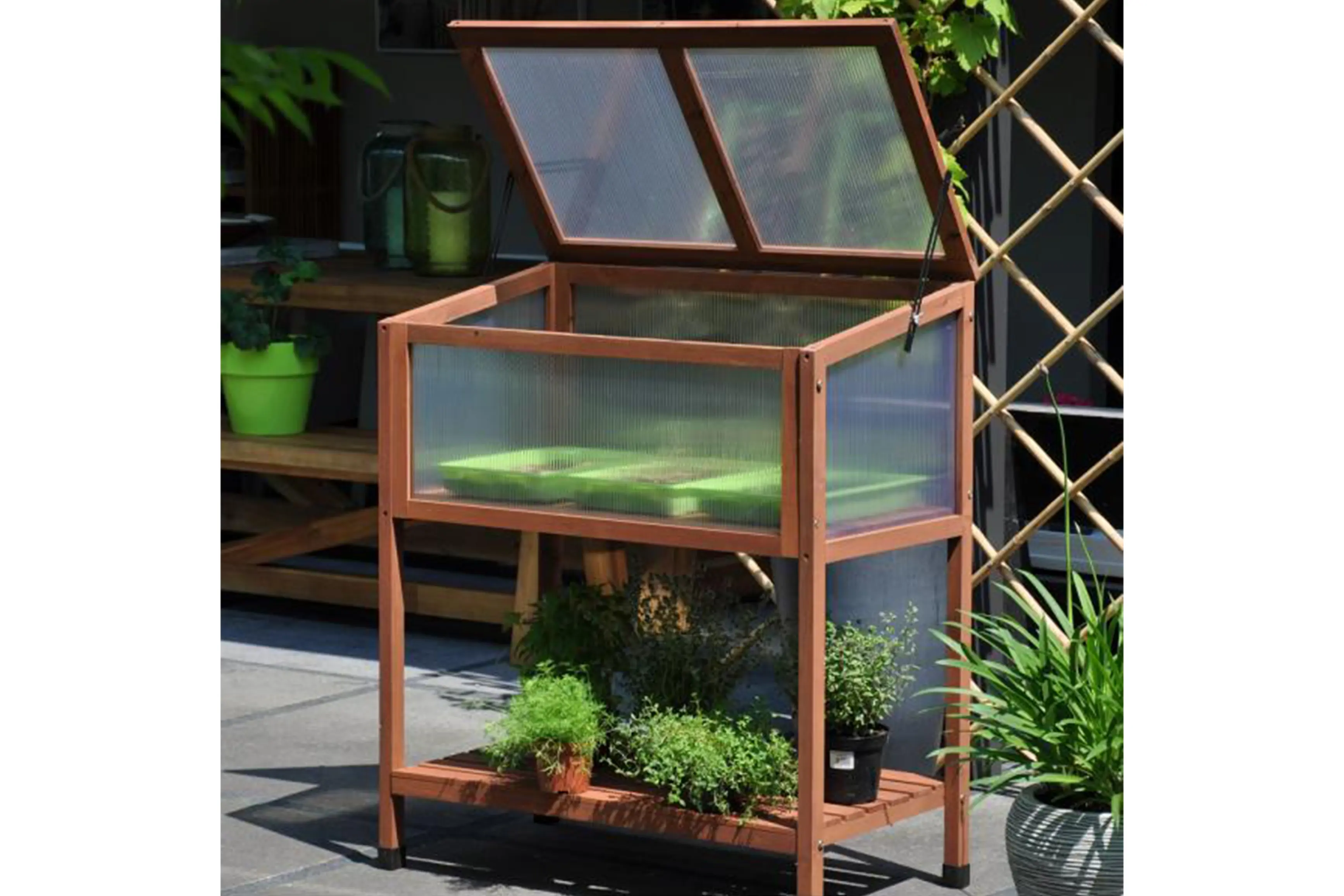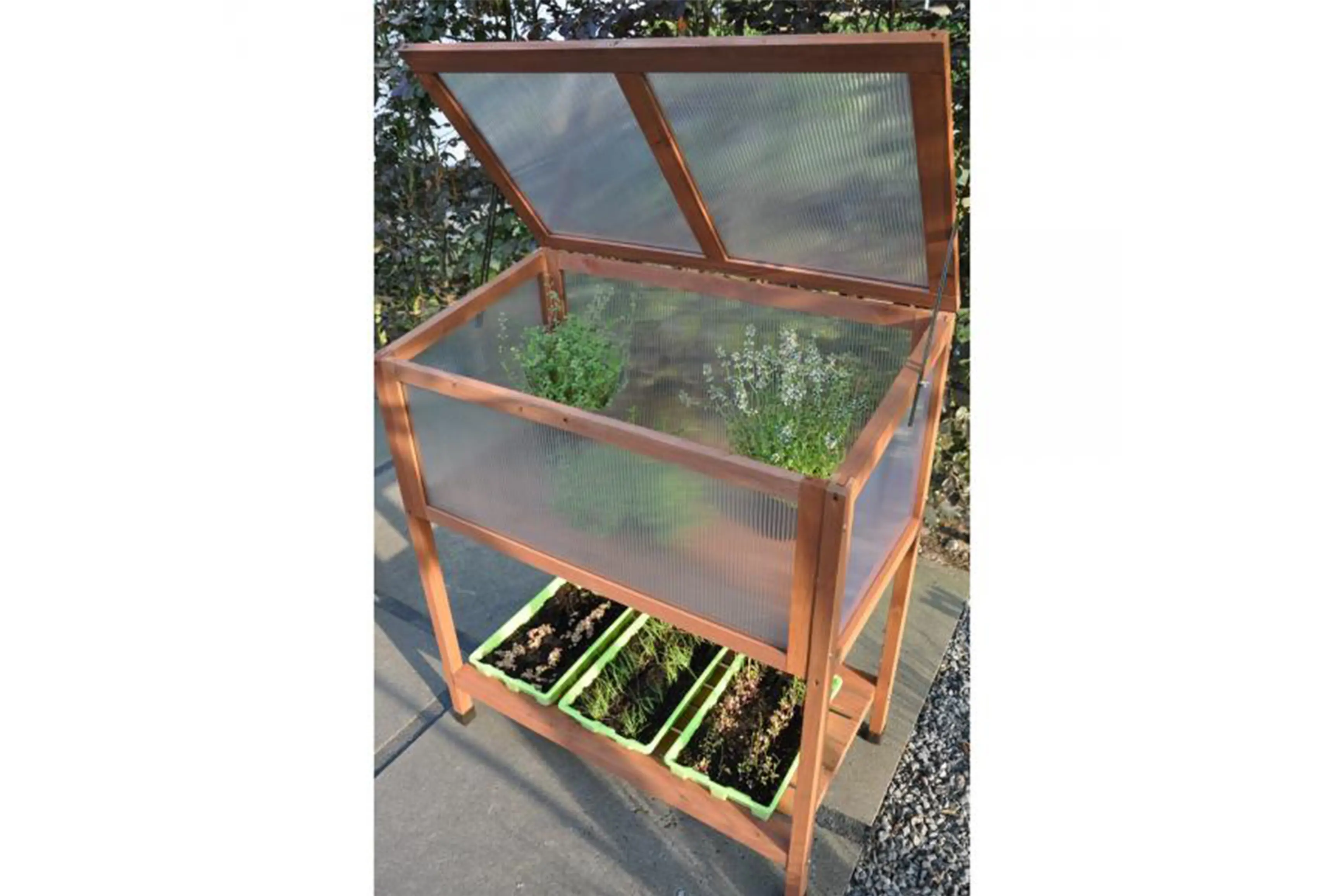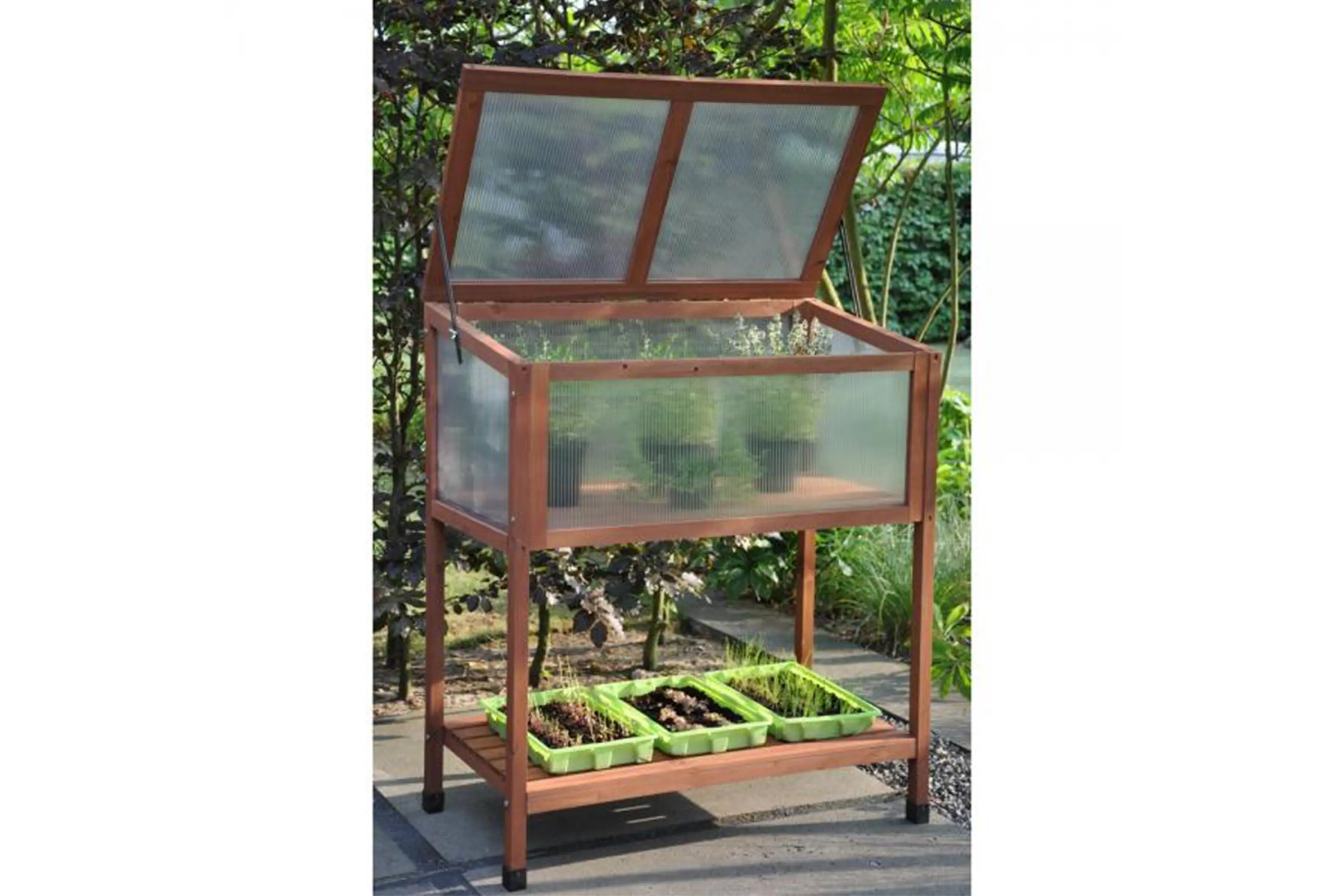 Het hout is verduurzaamd, heeft een bruine kleur en is afkomstig uit duurzaam beheerde bossen. De kweekbak is voorzien van een dichte houten bodem en heeft een afdichting in 4 mm polycarbonaat. De bovenkant kan opengeklapt worden en is voorzien van raamuitzetters met vleugelmoer en windvaste borging in verschillende standen. Bovendien is er onderaan een extra schap in hout voorzien waar je gereedschap op kwijt kunt of nog extra planten kunt zetten.