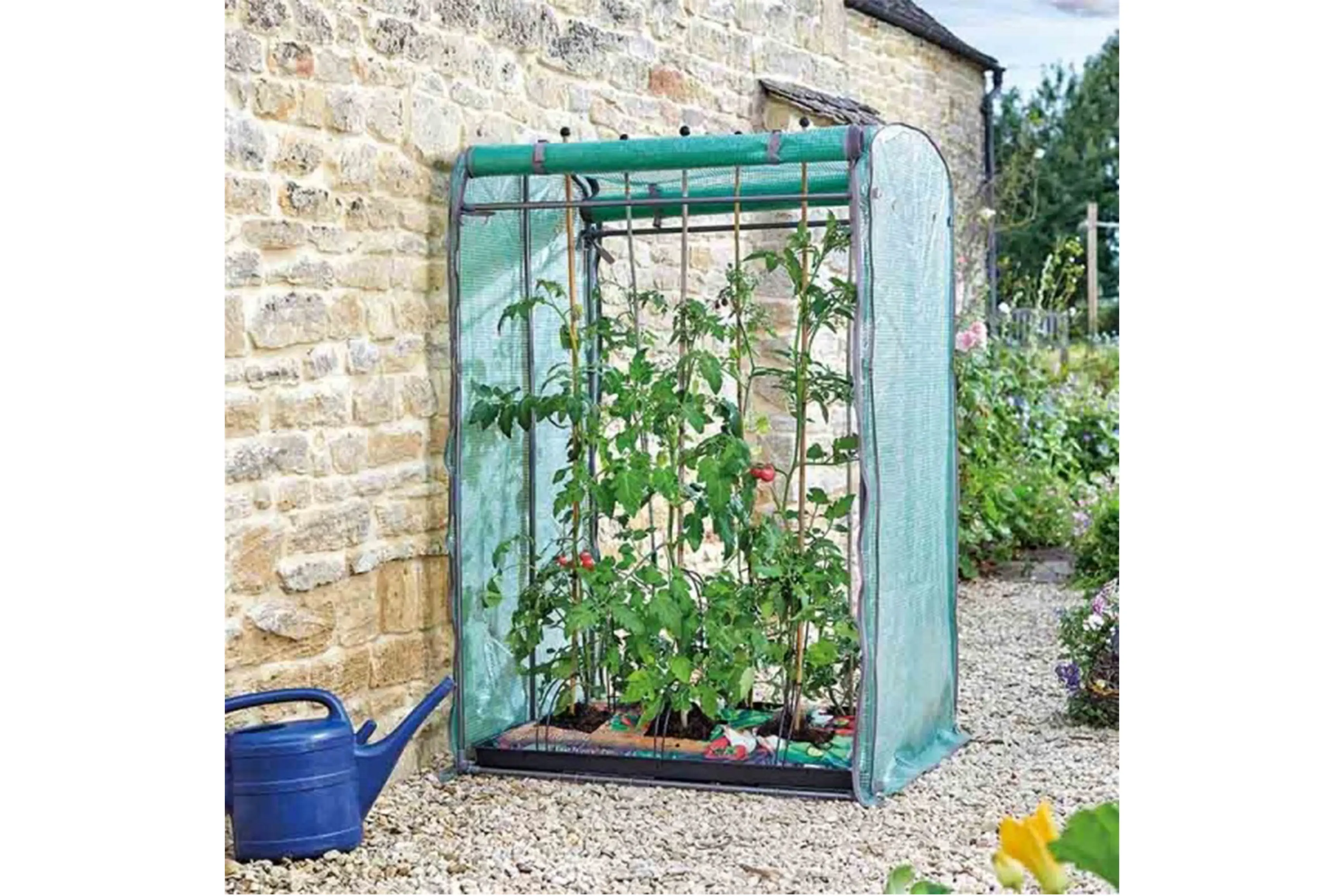 In het dak zijn er zes openingen voorzien waarin steunstokken passen. De tomatenkas kan stevig in de grond worden verankerd met bodemverankeringspinnen en stormkoorden. Deze worden niet meegeleverd.