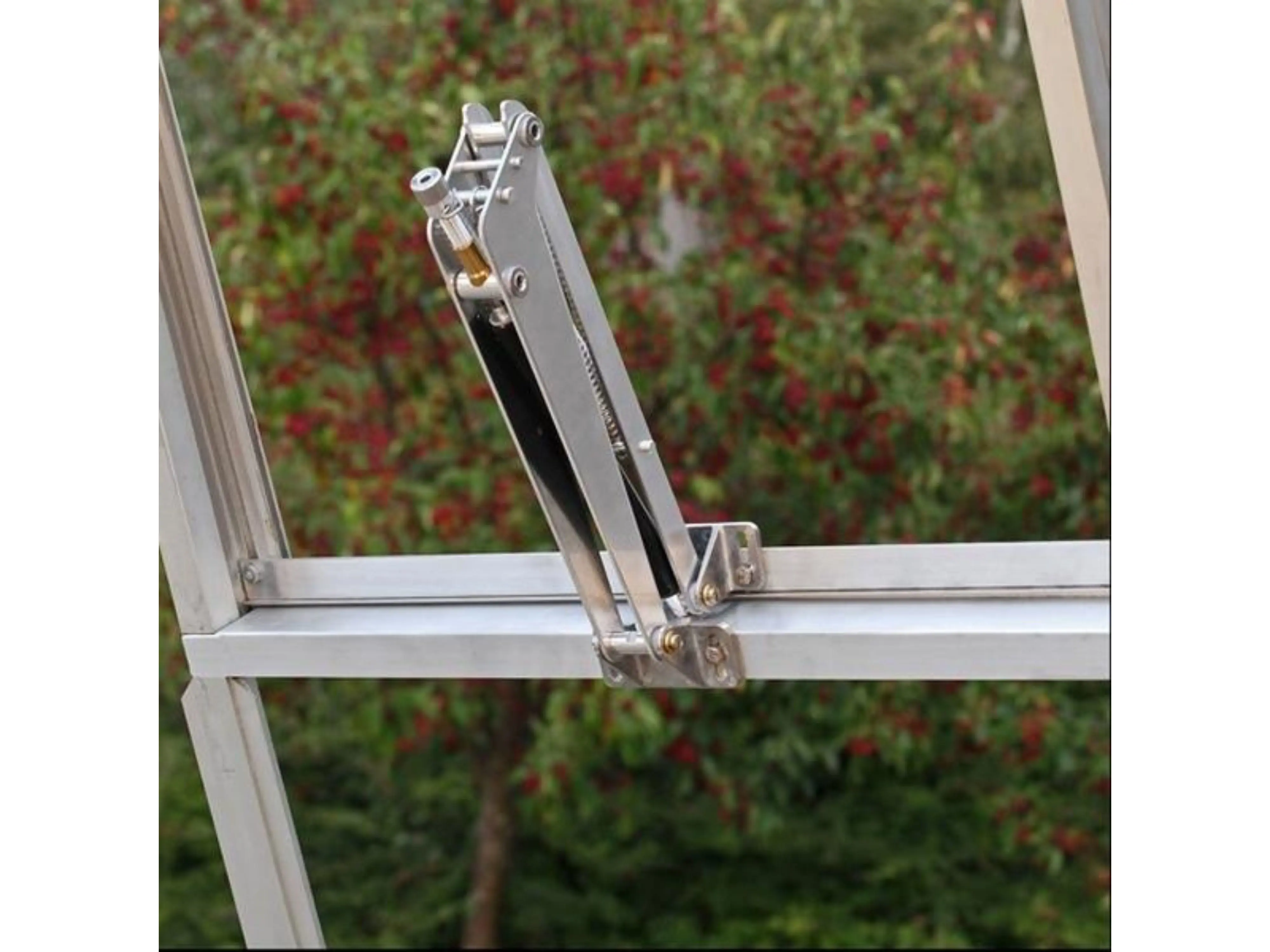 Automatische raamopeners werken op zonnewarmte en zijn onmisbaar in elke kas of serre. Deze Megavent raamopener is een zeer stevige universele raamopener die ramen tot 24 kg kan liften. De raamopener is ontwikkeld voor tuinkassen van zwaardere kwaliteit met dubbele of bredere ramen van bijvoorbeeld 70 cm. De bevestiging is eenvoudig en gebeurd met behulp van bouten en moeren aan het aluminium frame.