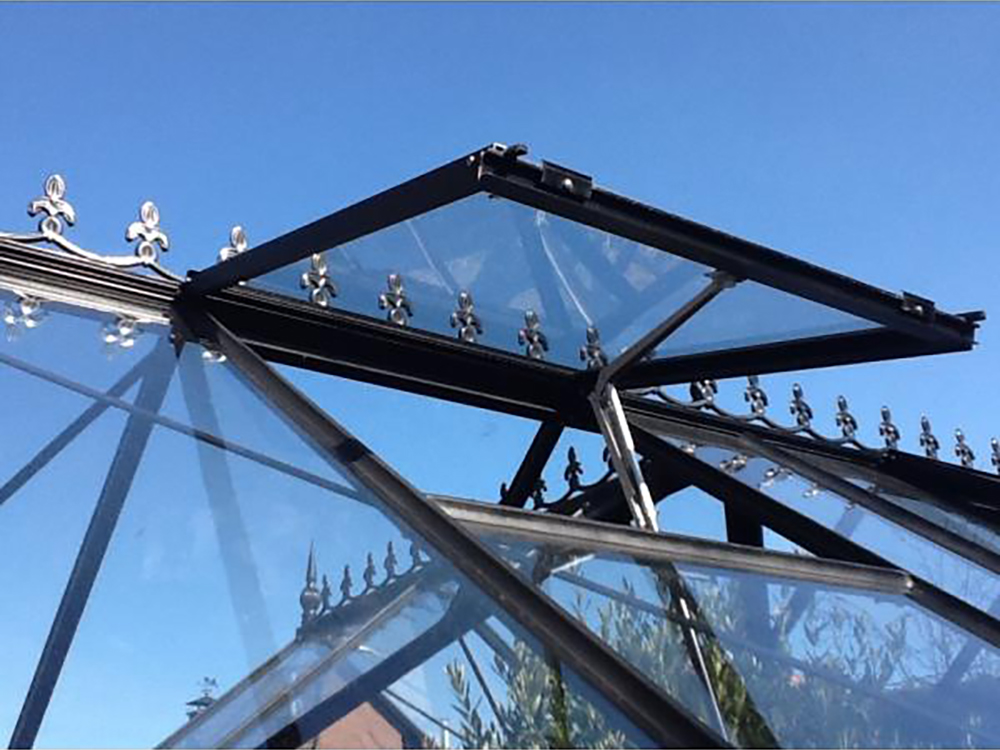 Een raamopener is ook handig als je op verlof bent. Zo moet je niemand lastig vallen om de ramen van je serre open te zetten of te sluiten. De raamopener werkt als een hydraulisch pompje met een staaf (met olie) in een cilinder. Het systeem reageert op temperatuurschommelingen en zet uit bij een hogere temperatuur waardoor het venster langzaam via een hefboommechanisme open wordt geduwd. Ook het sluiten gaat op een zachte manier, dus geen angst voor plots dichtvallende ramen en glasbreuk.