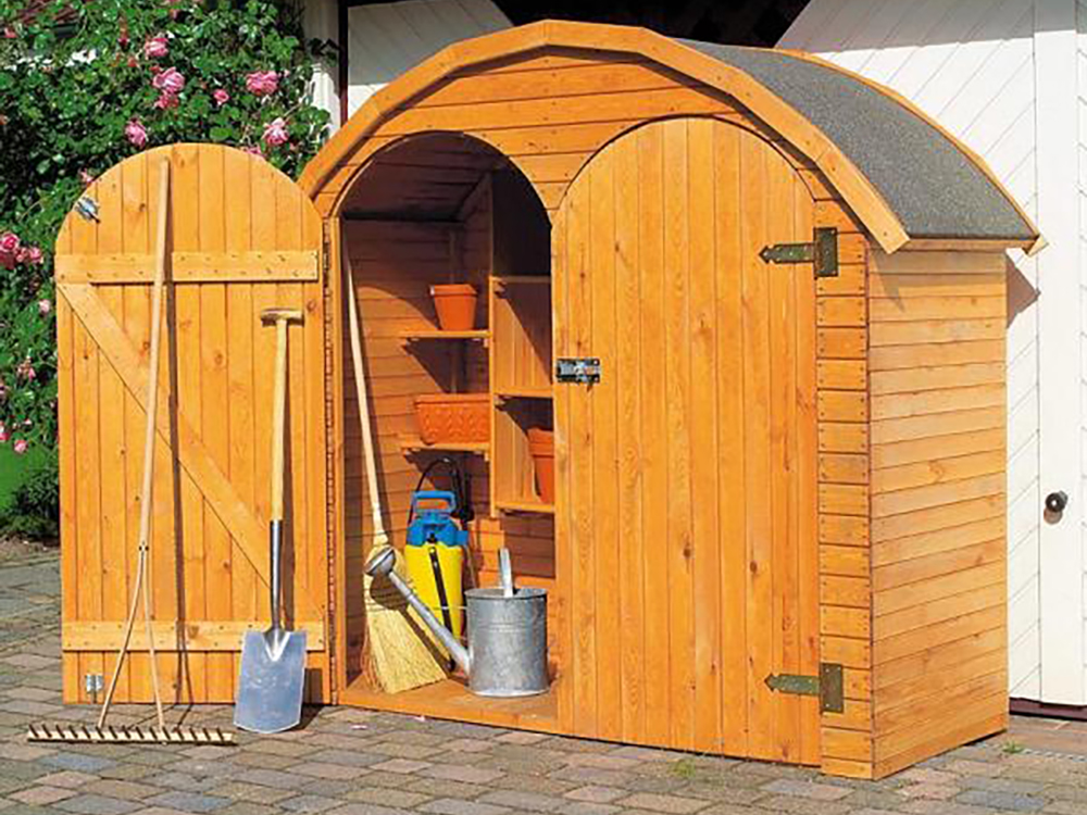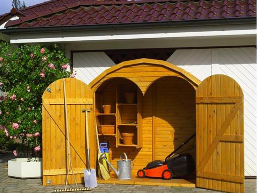 Mooie grenenhouten tuinberging met dubbele deur en mooi rond dak afgewerkt in dakleer. In deze tuinberging kan je heel wat tuinmateriaal kwijt! Het is een mooi formaat voor in een middelgrote tuin maar past ook in een kleinere ruimte of binnenkoer.