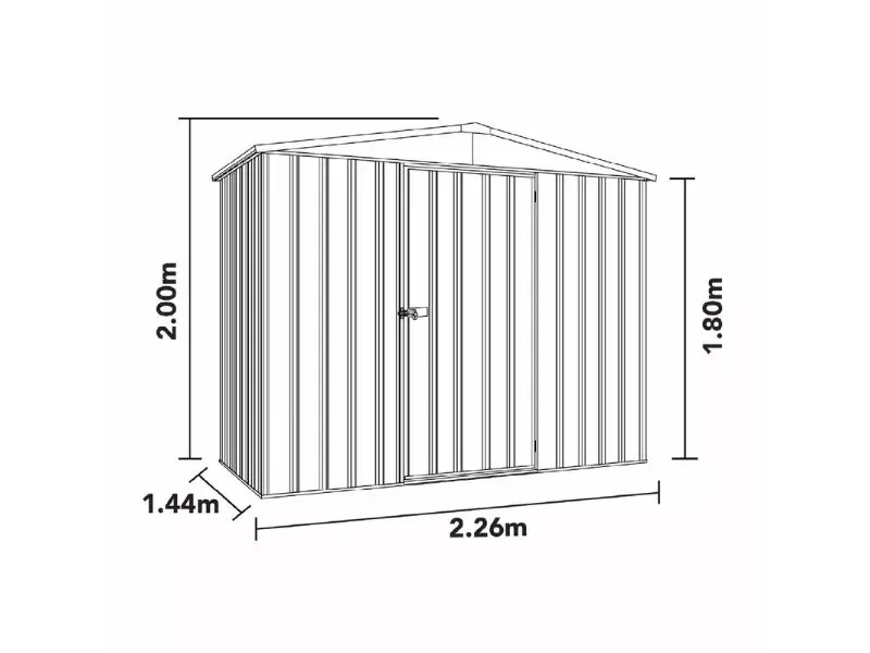 De ruime deur van 75 x 172,5 cm garandeert een gemakkelijke toegang, zelfs voor grote spullen. Het zadeldak zorgt voor een binnenhoogte van 1,80 m tot 2 m, wat zorgt voor veel gebruikscomfort en gemakkelijke bewegingsruimte binnenin. De schuur neemt in uw tuin een totale oppervlakte in van 2,26 m breed, 1,44 m diep en 2 m hoog.