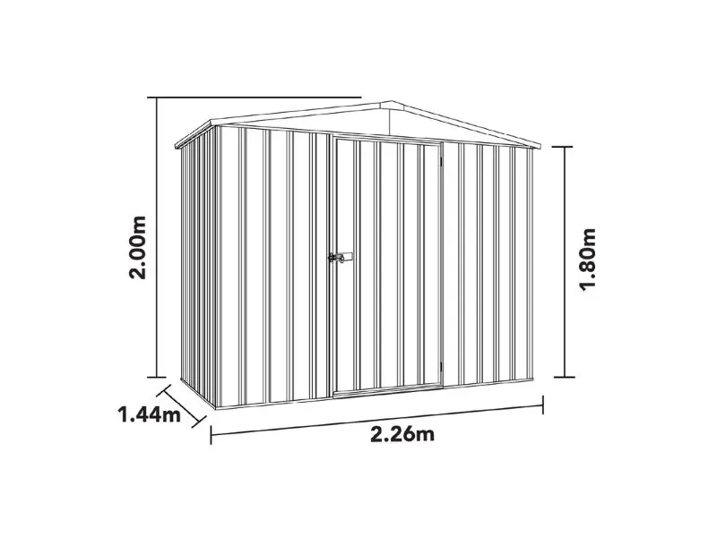 De ruime deur van 75 x 172,5 cm garandeert een gemakkelijke toegang, zelfs voor grote spullen. Het zadeldak zorgt voor een binnenhoogte van 1,80 m tot 2 m, wat zorgt voor veel gebruikscomfort en gemakkelijke bewegingsruimte binnenin. De schuur neemt in uw tuin een totale oppervlakte in van 2,26 m breed, 1,44 m diep en 2 m hoog.