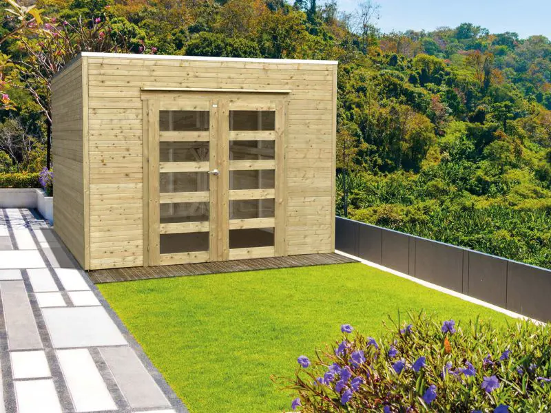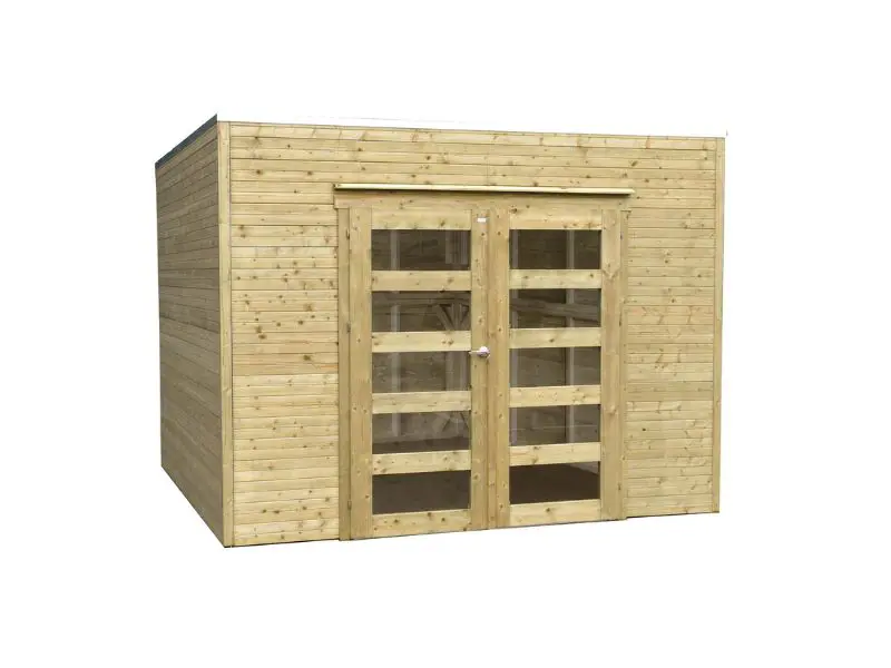 Verschillende vooraf gemonteerde wandpanelen worden zijdelings of loodrecht tegen elkaar geplaatst en onderling verbonden. Voorzien van een dak met houten planken van 16mm en van een EPDM. Transparant gehard glas. Slot met kinderbeveiliging.