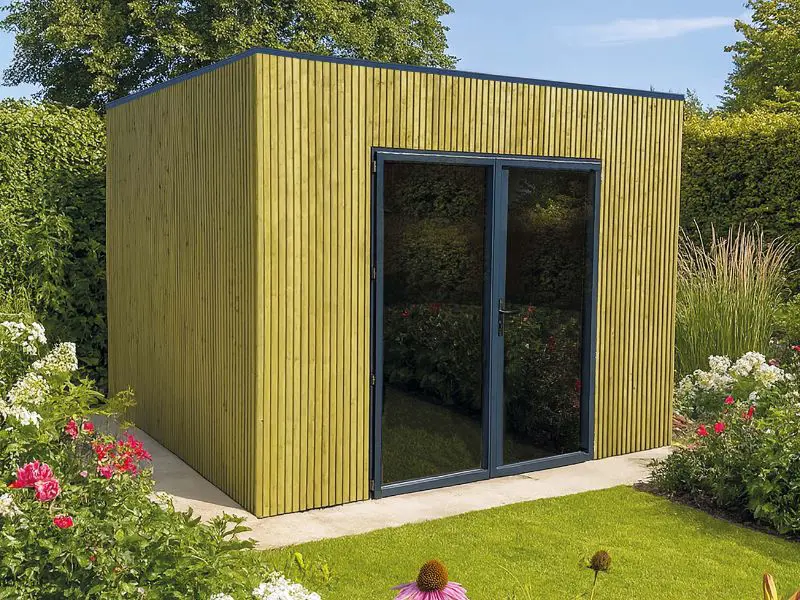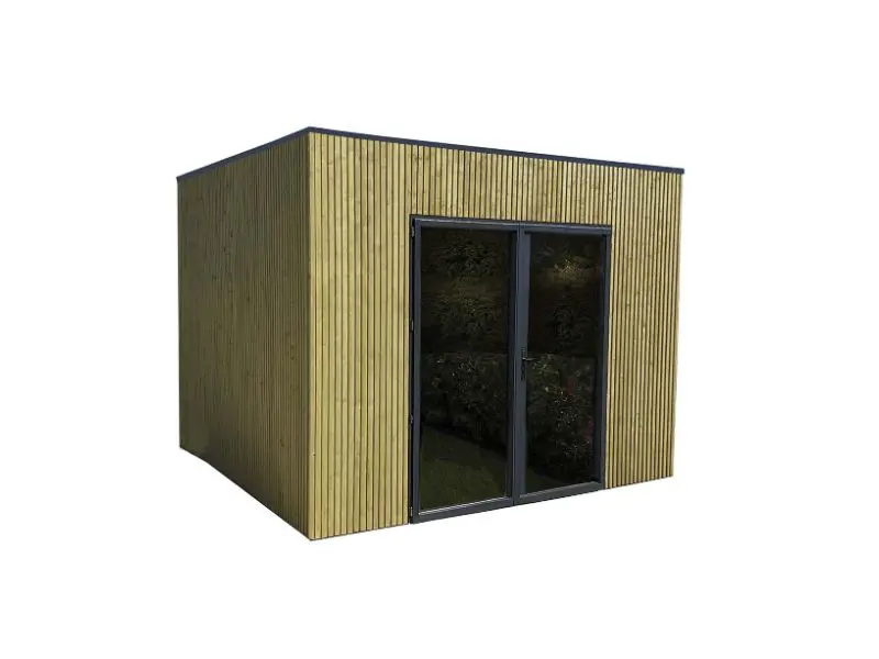 Verschillende vooraf gemonteerde wandpanelen worden zijdelings of loodrecht tegen elkaar geplaatst en onderling verbonden. Voorzien van een dak met houten planken van 16mm en van een EPDM. Transparant gehard glas. Slot met kinderbeveiliging.