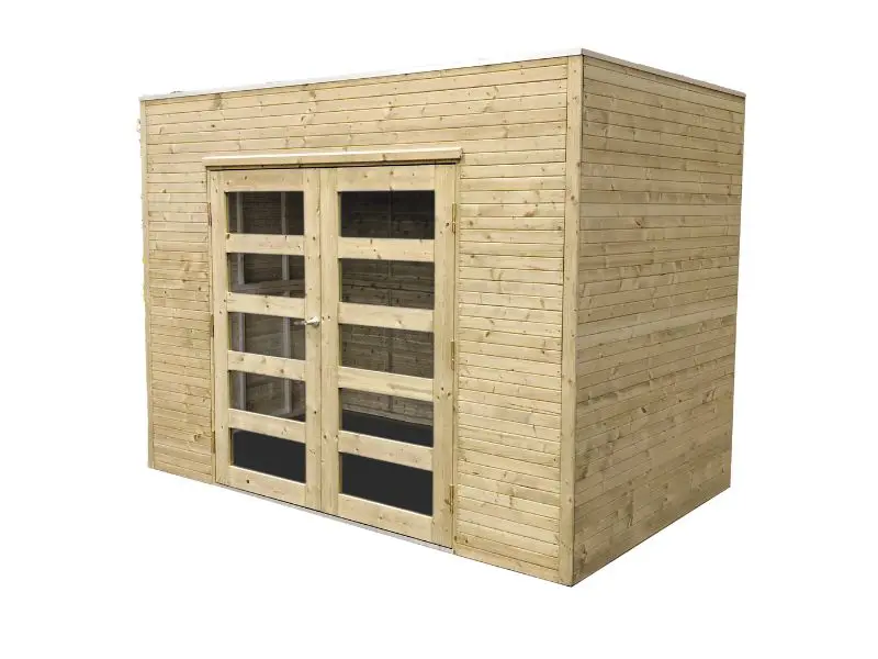 Verschillende vooraf gemonteerde wandpanelen worden zijdelings of loodrecht tegen elkaar geplaatst en onderling verbonden. Voorzien van een dak met houten planken van 16mm en van een EPDM. Transparant gehard glas. Slot met kinderbeveiliging.