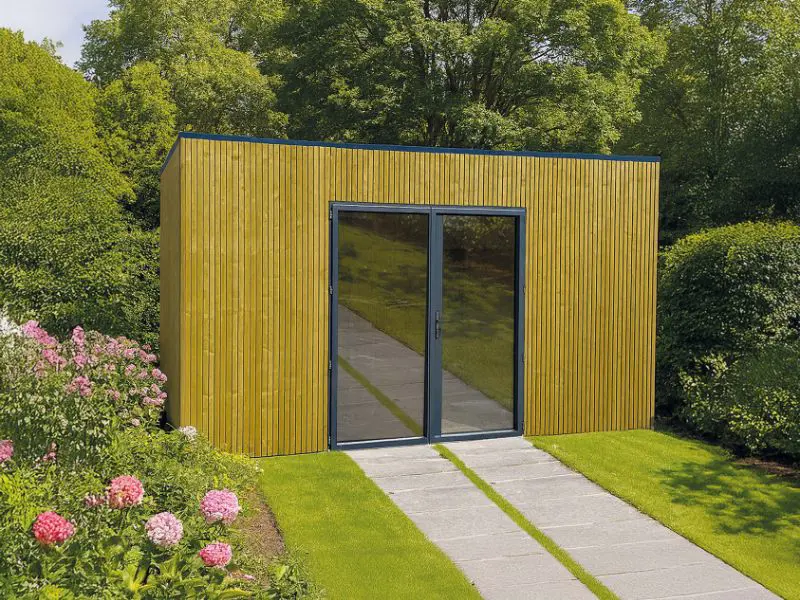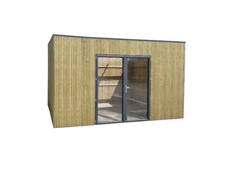 Verschillende vooraf gemonteerde wandpanelen worden zijdelings of loodrecht tegen elkaar geplaatst en onderling verbonden. Voorzien van een dak met houten planken van 16mm en van een EPDM. Transparant gehard glas. Slot met kinderbeveiliging.