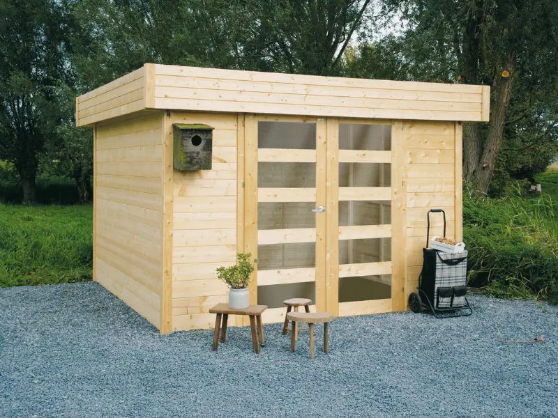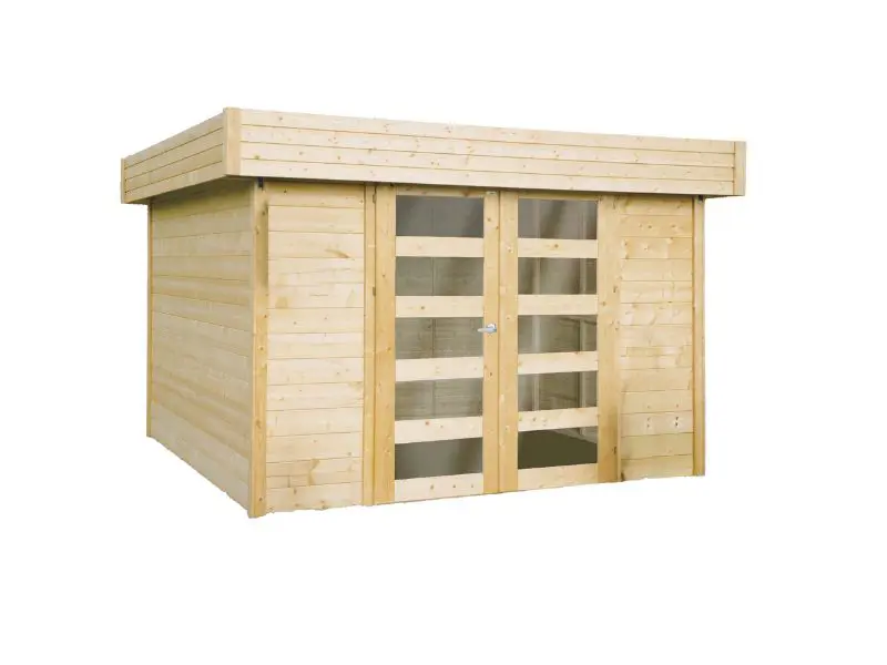Houten profielen met tand en groef die makkelijk in elkaar te schuiven zijn en waarvan de uiteinden geconnecteerd worden via een metalen profiel. Voorzien van een dak met houten planken van 16mm en van een zwarte roofing. Transparant gehard glas.