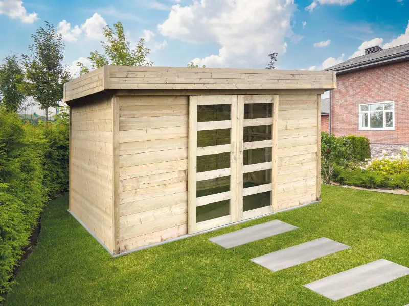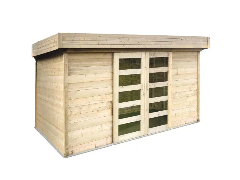 Het traditionele blokhut bouwsysteem waarbij houten profielen met tand en groef op elkaar worden geplaatst. Voorzien van een dak met houten planken van 16mm en van een zwarte roofing. Transparant gehard glas. Slot met kinderbeveiliging. Ventilatieset.