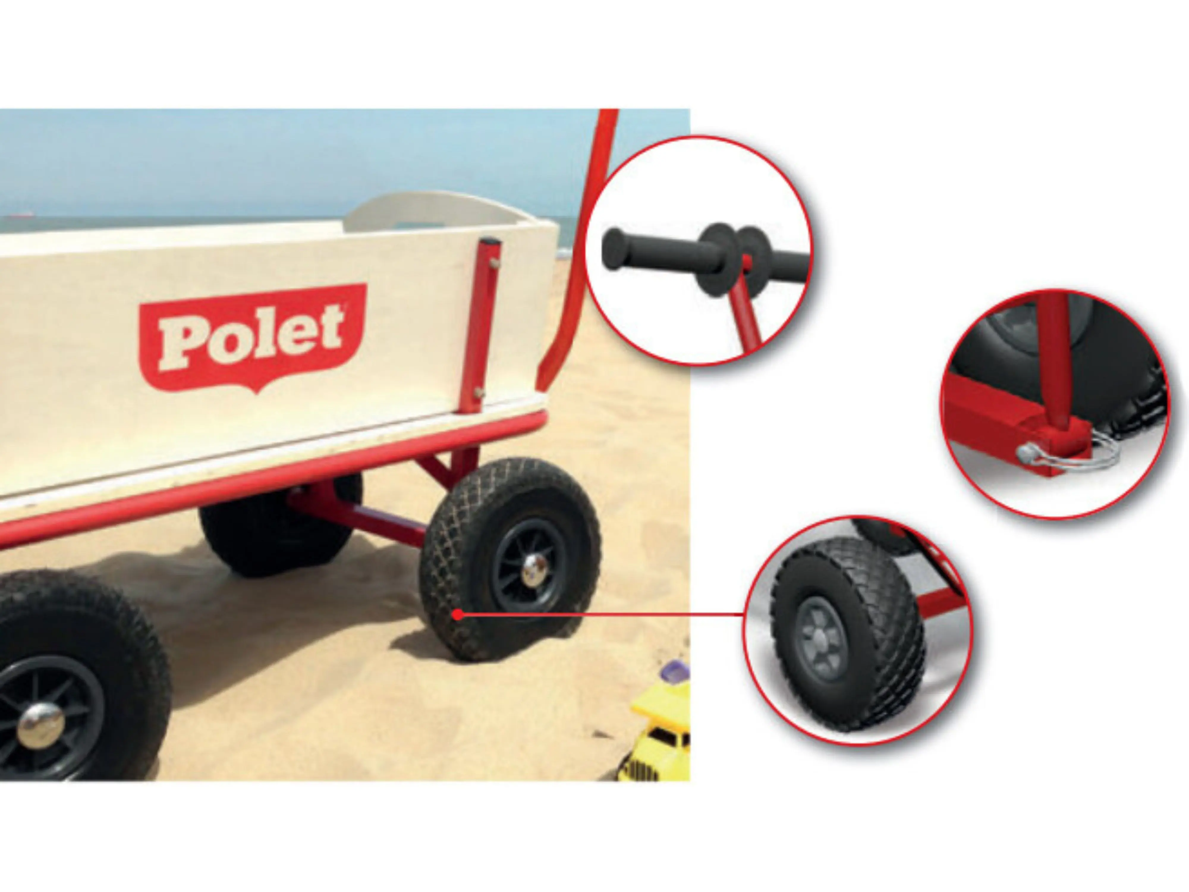 De kar is uitgerust met 4 luchtbanden voor extra rijcomfort en 4 houten panelen, waarvan 2 met een handvat. Met het lang en dubbel handvat is de wagen makkelijk te besturen. Ook kinderen vinden het geweldig om er een ritje mee te maken.