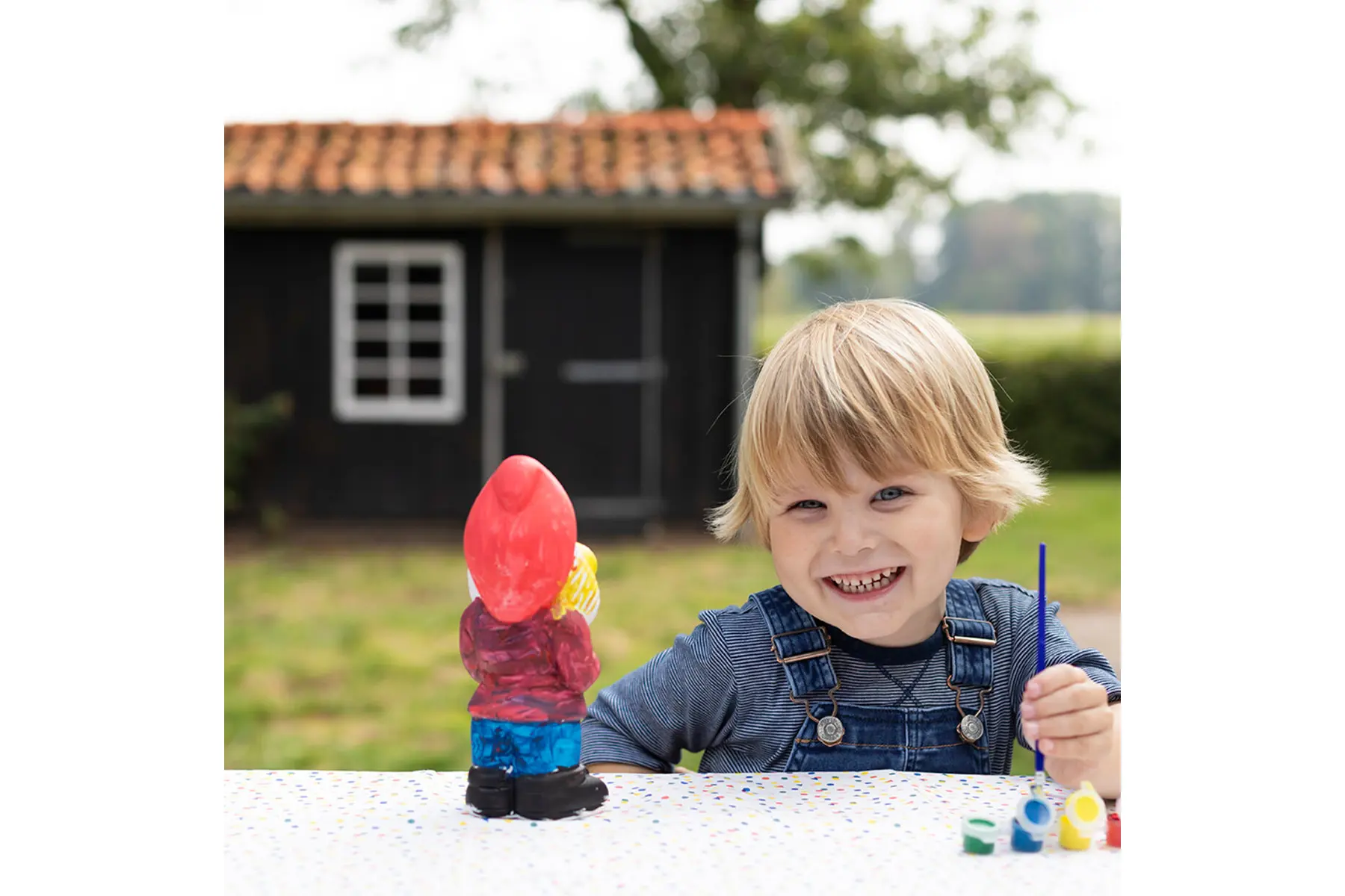 Het setje bevat een onbeschilderde tuinkabouter in gips, 6 kleurtjes en een verfborstel.