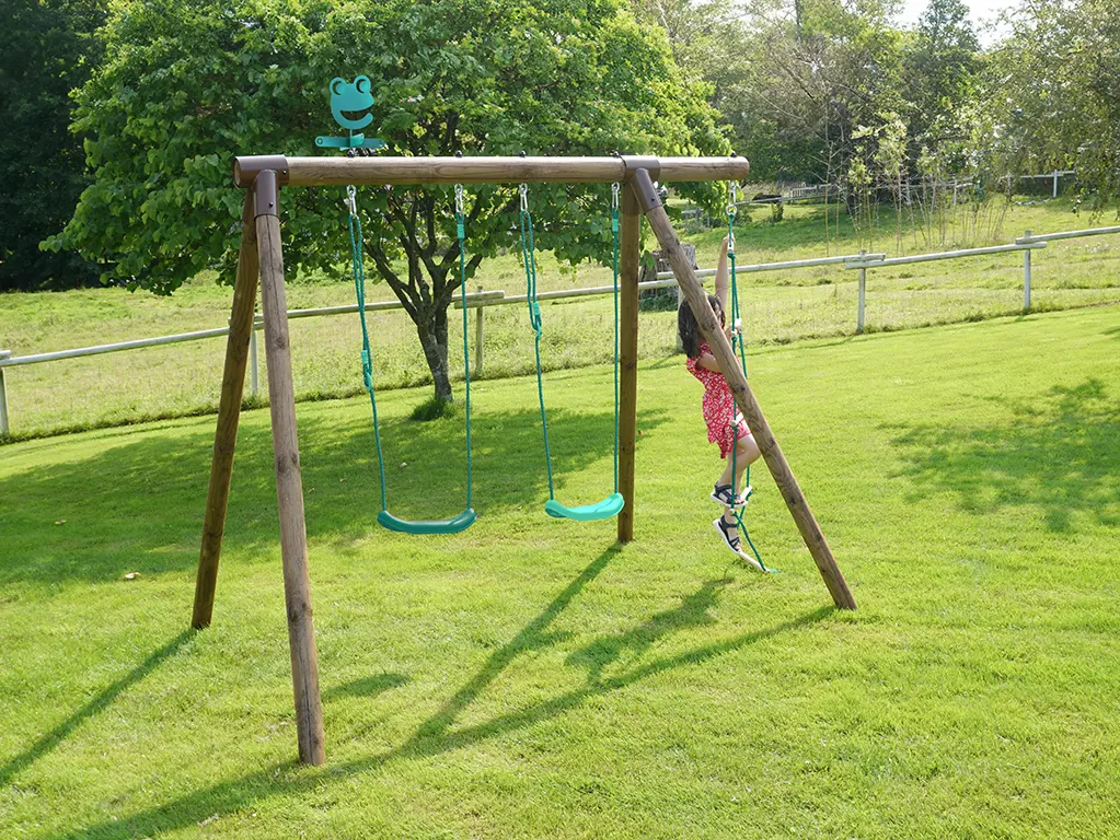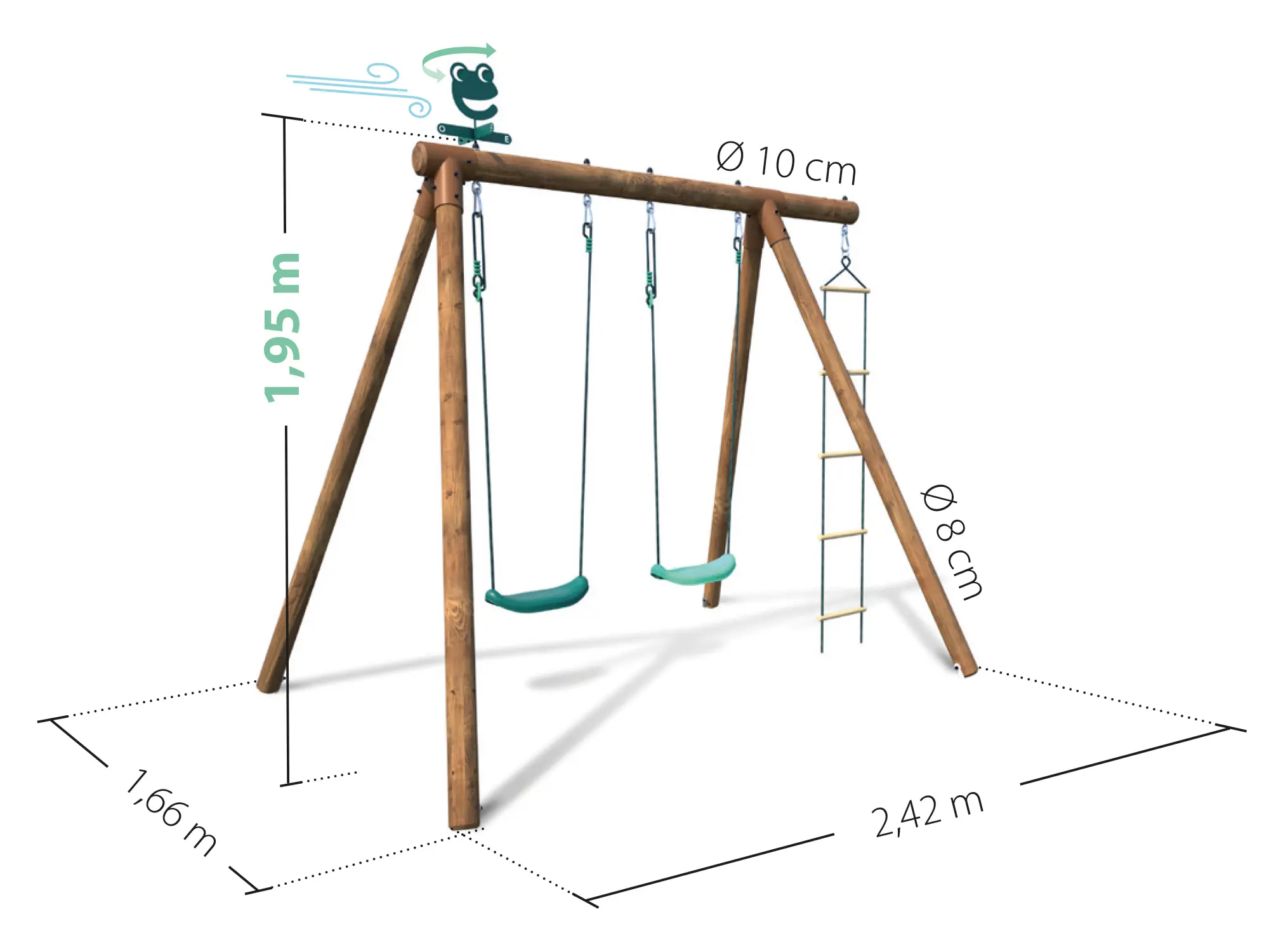 De schommel wordt geleverd als een bouwpakket, maar is eenvoudig te monteren. De ronde palen van het frame zijn voorgeboord en met de grondankers kan het geheel stevig in de grond worden bevestigd. Het frame is ook versterkt met stalen profielen op de hoeken voor extra stabiliteit.