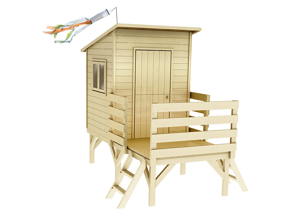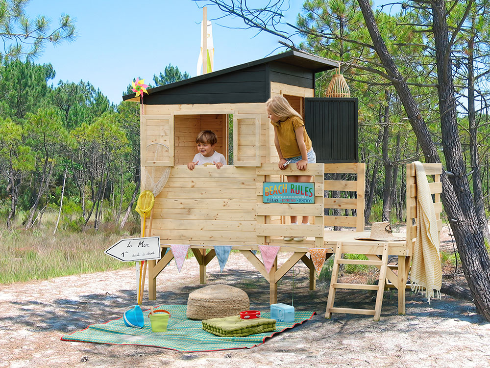 Het houten speelhuis Oakland is een stevig speelhuis gemaakt van kwalitatief gedroogd hout. Het staat op een hoogte van 60 cm met de uitstraling van een strandcabine, waardoor het perfect past in elke tuin. Het speelhuisje biedt niet alleen een veilige speelomgeving, maar ook eindeloos speelplezier. Vier kinderen kunnen tegelijkertijd fun beleven!