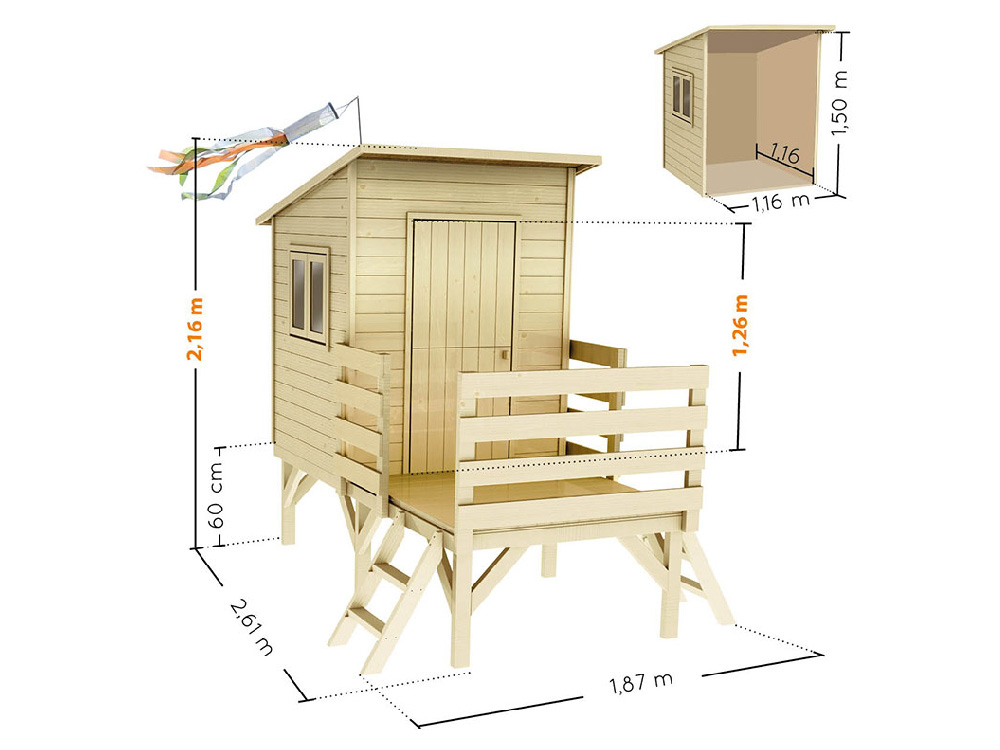 Met een binnenoppervlakte van 1,35 m² en een totale oppervlakte van 4,28 m² is er voldoende ruimte voor avontuurlijke activiteiten. Laat je kinderen hun eigen speelwereld creëren in het kwalitatieve speelhuis Oakland van Soulet.