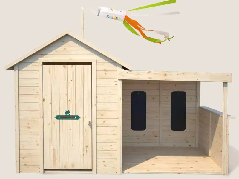 Het Sarah-huisje wordt geleverd met leuke accessoires om het een persoonlijk tintje te geven: een kleurrijke windvaan die het geheel een speels accent geeft, en een brievenbus in de kleuren van Soulet, perfect voor briefjes of verrassingen die vriendjes met elkaar kunnen uitwisselen.