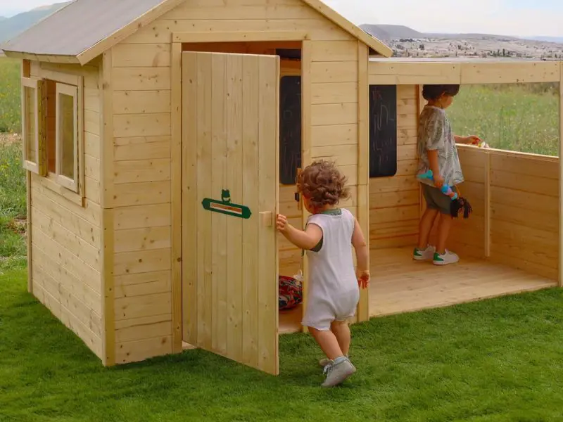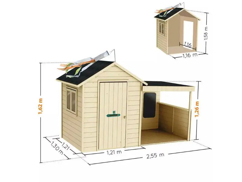 De hut is uitgerust met een magnetische klapdeur (56 x 126 cm) die niet dichtslaat, en een venster met twee vleugels (57 x 45 cm) met plexiglas, wat zowel veiligheid, lichtinval als comfort garandeert. Twee in de structuur geïntegreerde schoolborden laten beginnende kunstenaars hun fantasie de vrije loop.