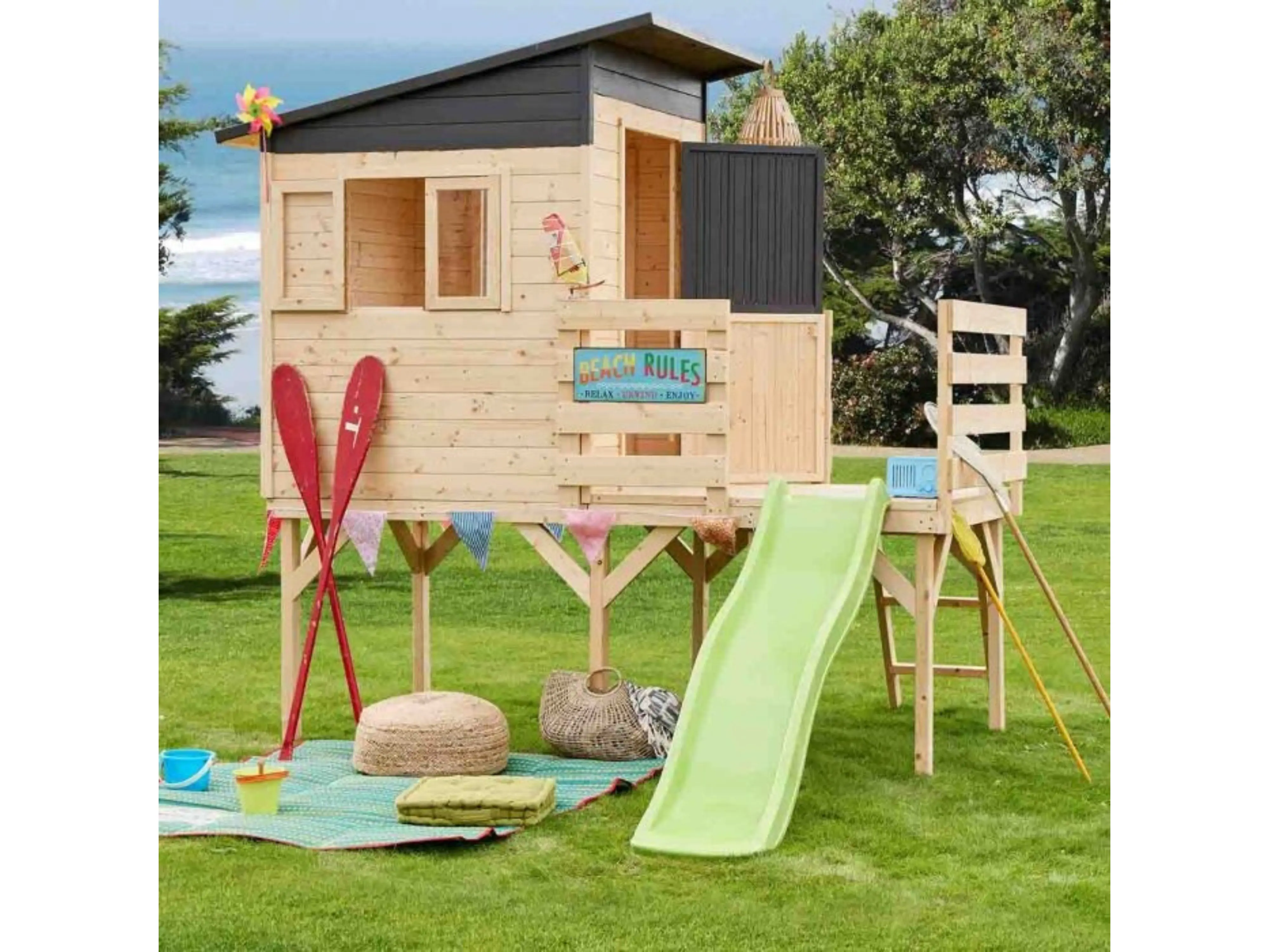 Het speelhuis Portland is een stevig speelhuisje in hout op een hoogte van 90 cm, speciaal ontworpen voor kinderen. Het speelhuisje is voorzien van een terras die beveiligd is met een omheining en gemakkelijk toegankelijk is via de stevige houten ladder. De glijbaan zorgt voor extra speelplezier en een snelle afdaling.