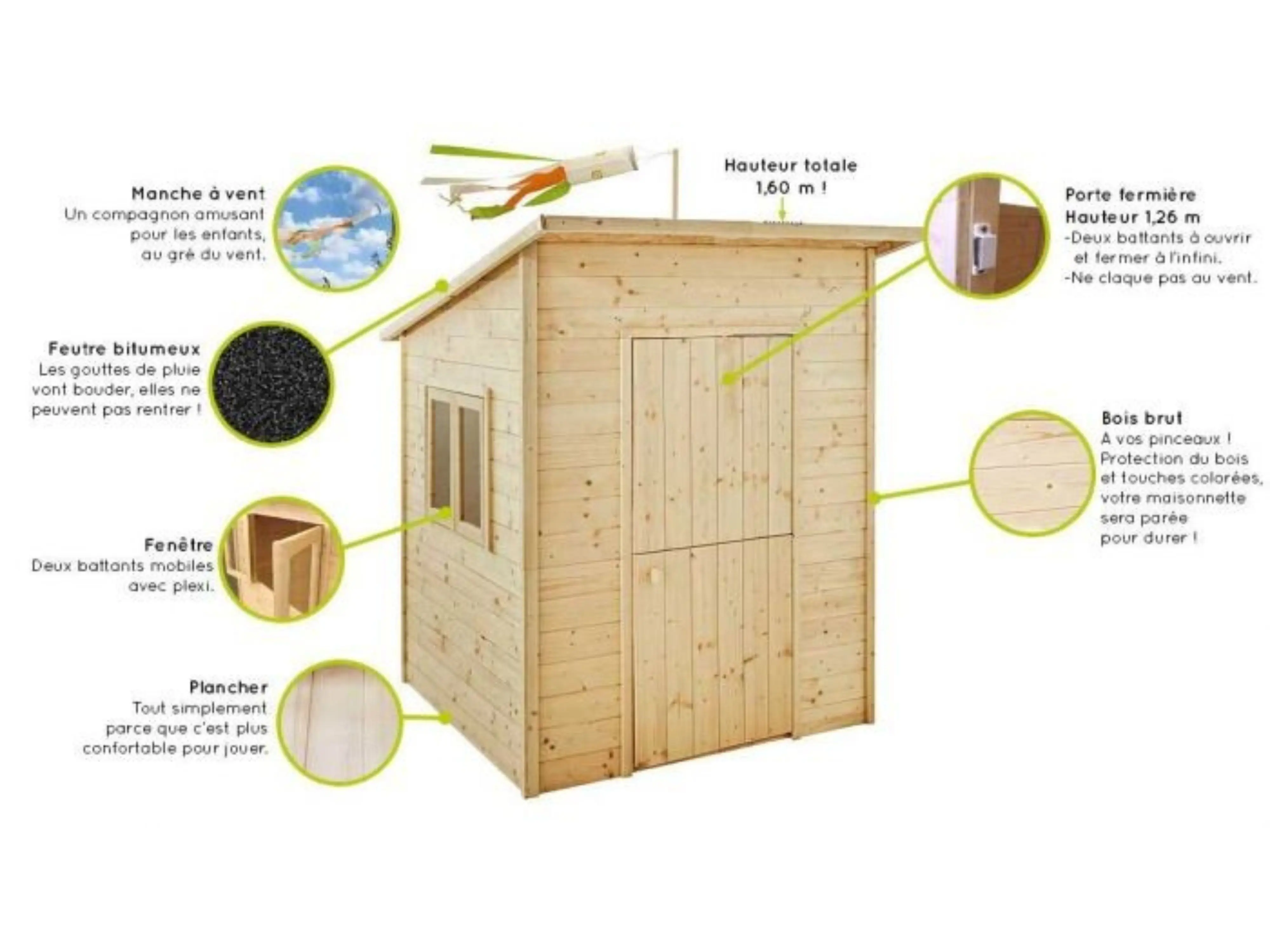 Het speelhuis Santa Monica is voorzien van een raam met plexiglas om tocht te voorkomen. De tweedelige deur is uitgerust met magnetische sluitingen, zodat deze gemakkelijk kan worden geopend en gesloten zonder bang te hoeven zijn dat ze door de wind openwaait. Met een binnenoppervlakte van 1,35 m² is er voldoende ruimte voor 2 kinderen om te spelen. De hoogte van 160 cm zorgt ervoor dat kinderen comfortabel kunnen bewegen in het speelhuis.