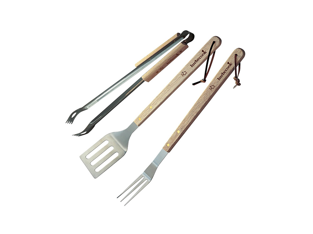 Bakken en grillen op de barbecue gaat zoveel beter met dit handig driedelig set van Barbecook. Een lange knijptang om al het eten op de grill te leggen, om te draaien, en als het klaar is af de grill te nemen. Een stevige vork met drie tanden om stukken vlees, aardappelen en vis te verleggen op de barbecue; en een spatel om hamburgers, een steak of vis ... in 1 keer op de grill om te draaien.