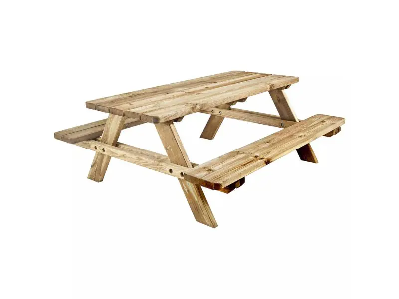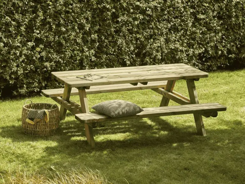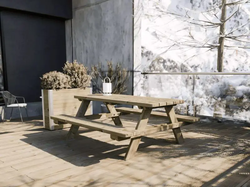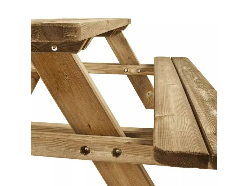 De tafel is gemaakt van grove den en behandeld met autoclaafklasse 3 groen, waardoor hij goed bestand is tegen vocht, insecten en externe invloeden. Dit duurzame en warme hout geeft een authentieke en natuurlijke uitstraling, die veel aangenamer is dan alternatieven van kunststof of composiet.