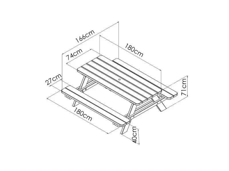 Met zijn royale afmetingen (180 cm breed, 166 cm lang, 70,7 cm hoog) biedt hij plaats aan maximaal 6 personen in optimaal comfort. De 4,5 cm dikke planken getuigen van zijn stevigheid, ideaal voor grote gezelschappen of herhaaldelijk gebruik.