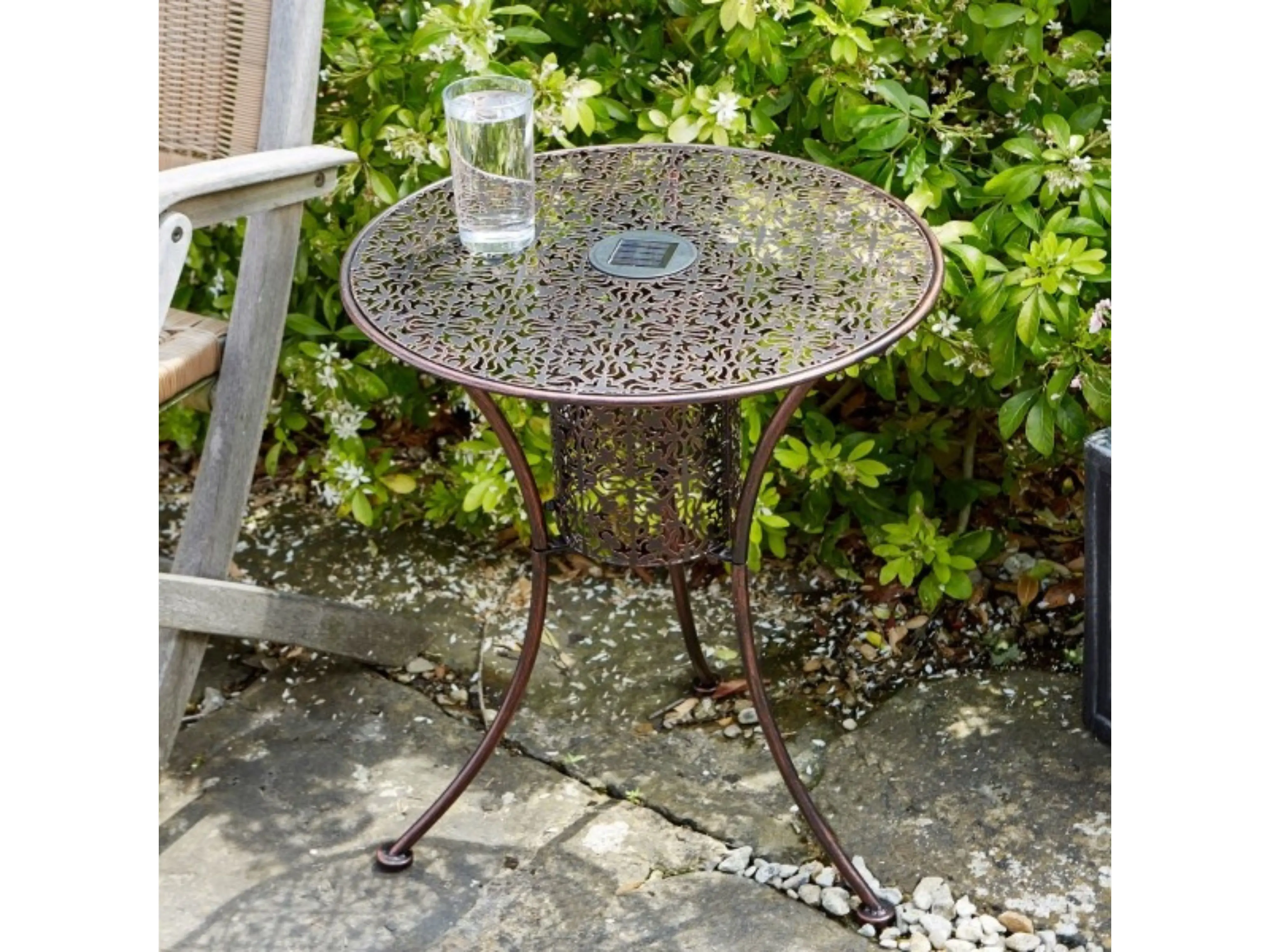 Deze leuke bijzettafel in sierlijk metaal heeft een centraal ingebouwd zonnepaneeltje in het tafelblad dat de bijhorende batterij oplaadt in vol zonlicht. Dit zorgt ervoor dat de tafel prachtig oplicht wannneer de avond valt!