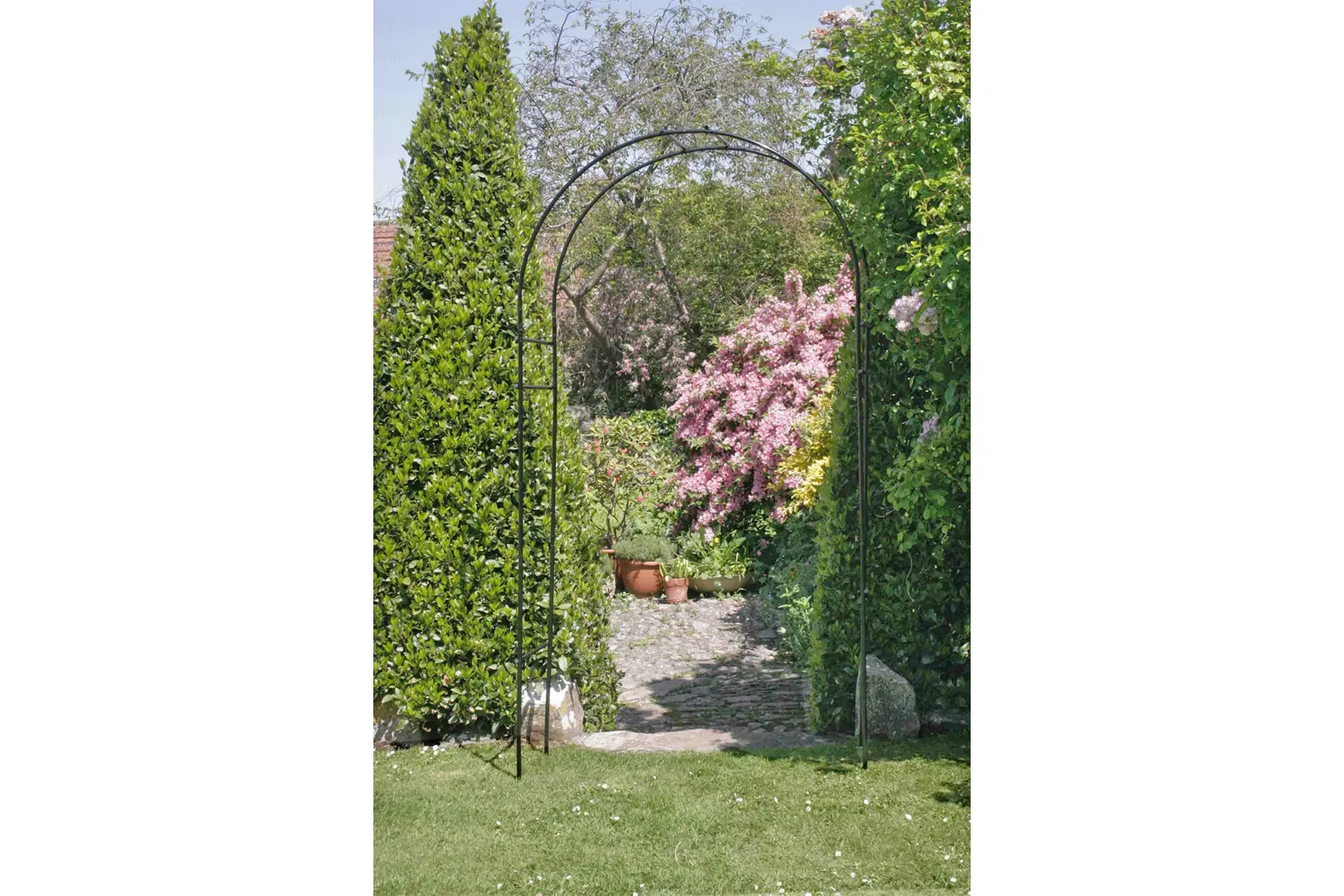 Zwarte, eenvoudig afgeronde rozenboog als leuke inkom voor tuinkamers of als doorgang van de voor- naar de achtertuin. Begroeid met klimrozen of andere klimplanten spreken ze tot de verbeelding en springen ze pas echt in het oog.