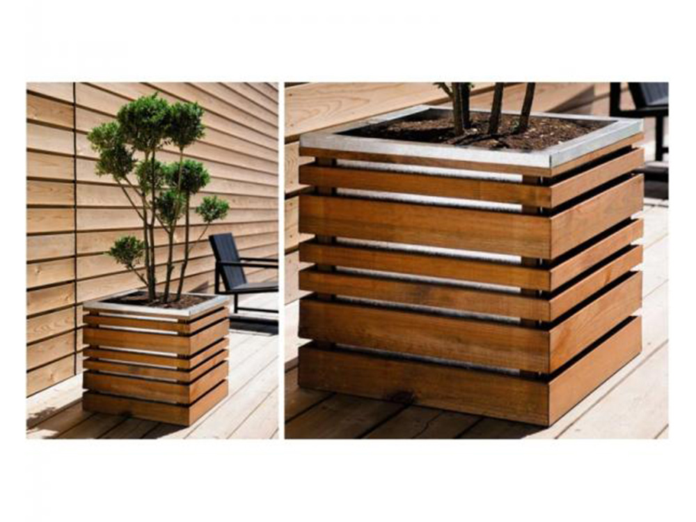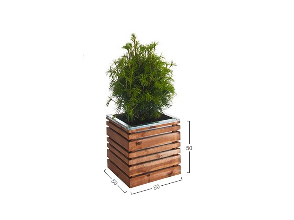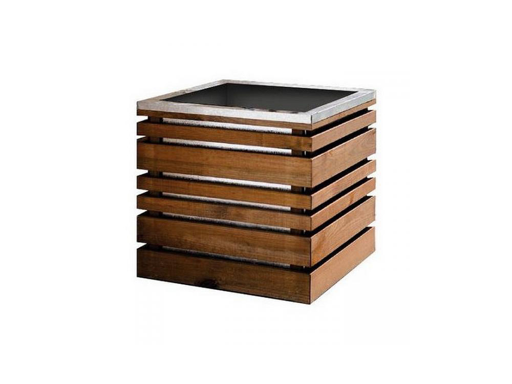 Mooie vierkante bloembak in hout. Deze houten plantenbak oogt modern omwille van de leuke combinatie van geïmpregneerd grenenhout en verzinkt metaal. De verzinkte plantenbak past bovenin de houten constructie en zorgt voor een mooi afgewerkte verzinkte bovenrand. Bovendien is de verzinkte bak zichtbaar doorheen het houtwerk.