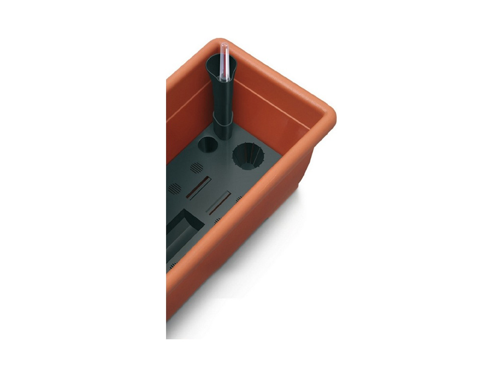 Deze kunststof bloembak heeft een handig bewateringssyteem zodat planten steeds langs onderen bevloeid kunnen worden. De dubbele bodem dient als waterreservoir en zorgt ervoor dat je minder vaak water moet geven. Er is een bevloeiingspijp met een meetindicatie die aangeeft hoeveel water er nog in de bak zit.