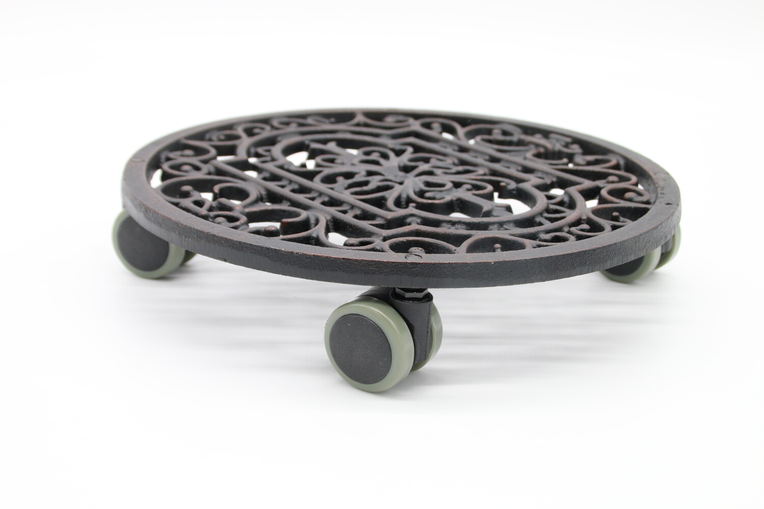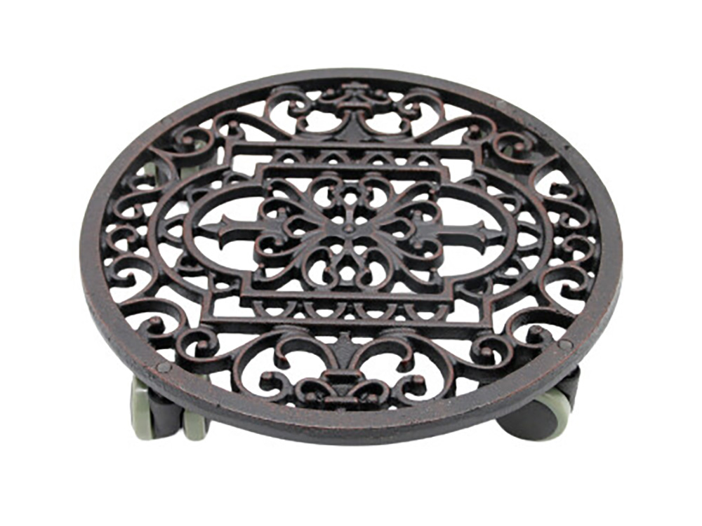 Klassieke victoriaanse ronde plantenrolley van Esschert design met mooi sierkrulwerk. Deze uitvoering is vervaardigd uit gietijzer en heeft een dikte van ongeveer 9 mm.