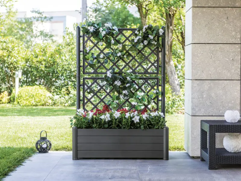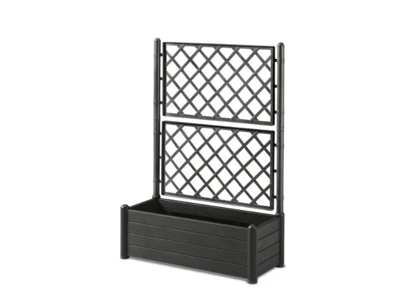 Geef je buitenruimte direct een upgrade met deze bloembak van hoogwaardige kunststof in een moderne grafietkleur. Dankzij het geïntegreerde latwerk biedt hij extra ondersteuning voor klimplanten en creëert hij een prachtige groene hoek vol leven.