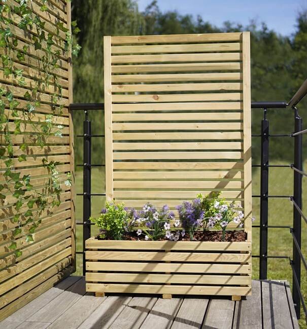 Leuke combinatie van plantenbak KÜB en een klimrek of houten tuinscherm. Deze bak heeft een leuke opbouw uit balkjes met een dikte van 25 mm en vomt de perfecte afboording van jouw balkon of terras.