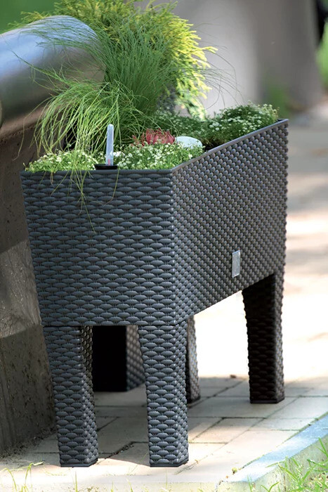 Aan de stand van de rode vlotter zie je hoeveel water er nog in de plantenbak aanwezig is. Deze bloempot is afgewerkt met een mooie ratan-look waardoor je de indruk krijgt dat het geweven kunststof is. De bak kan met of zonder poten worden gebruikt.