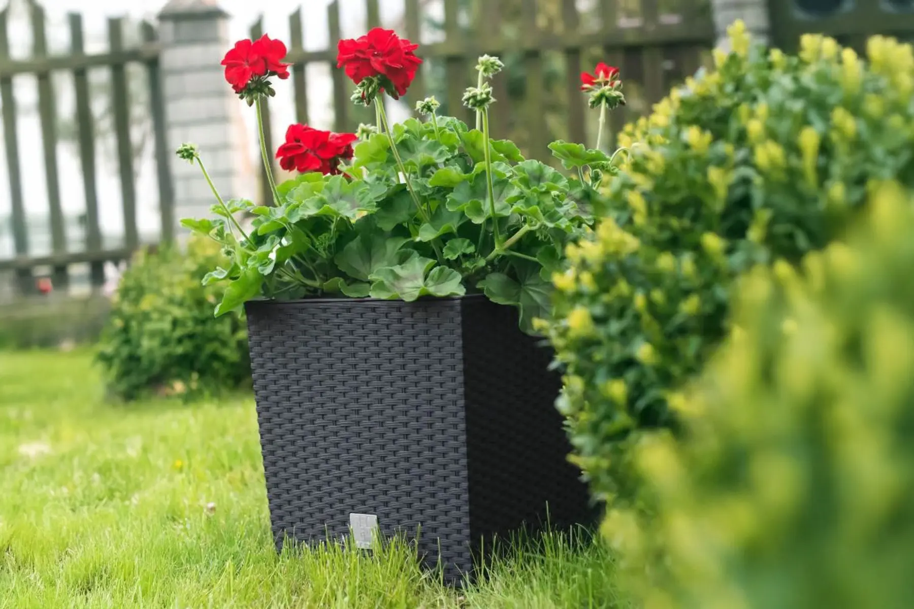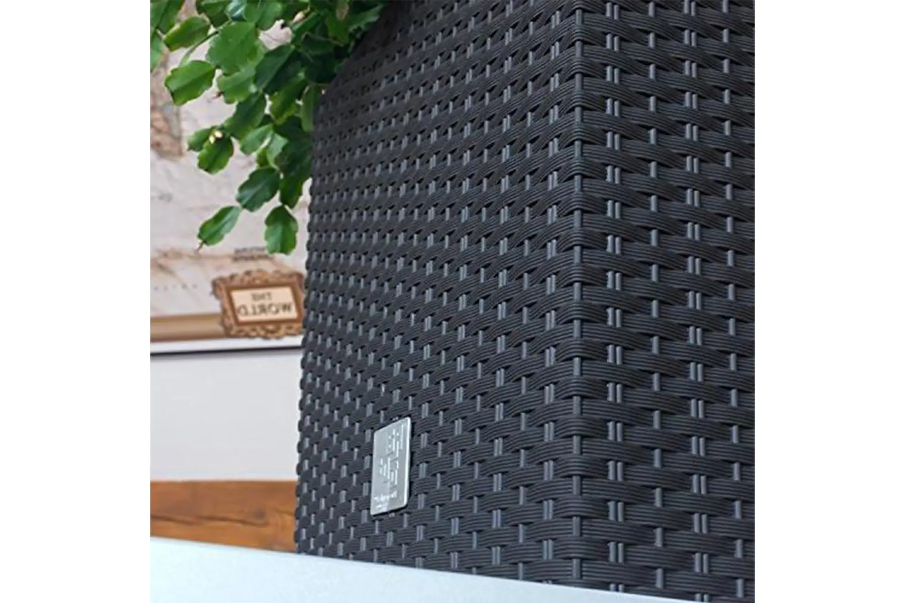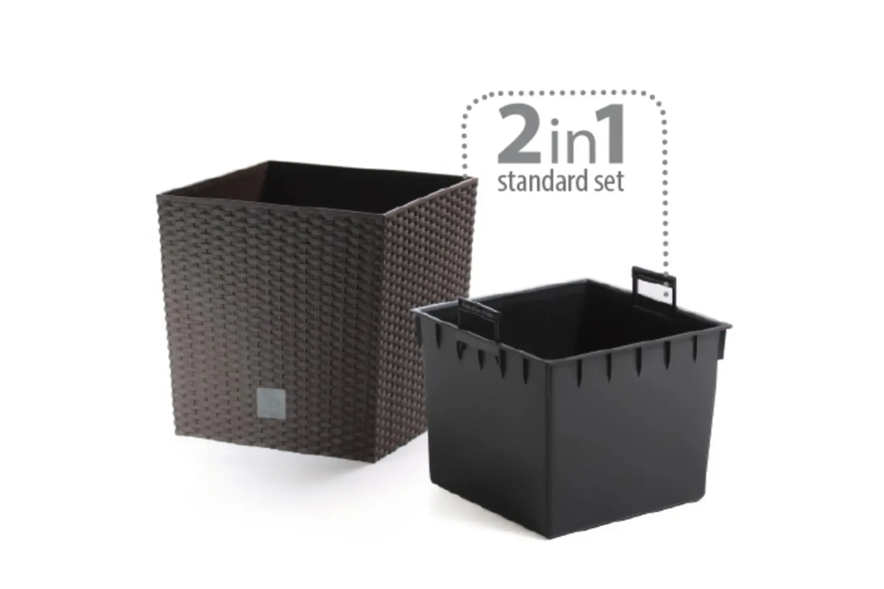 Mooie vierkante sierpot in duurzaam kunststof. Deze bloempot is afgewerkt met een mooie ratan-look waardoor je de indruk krijgt dat het geweven kunststof is.