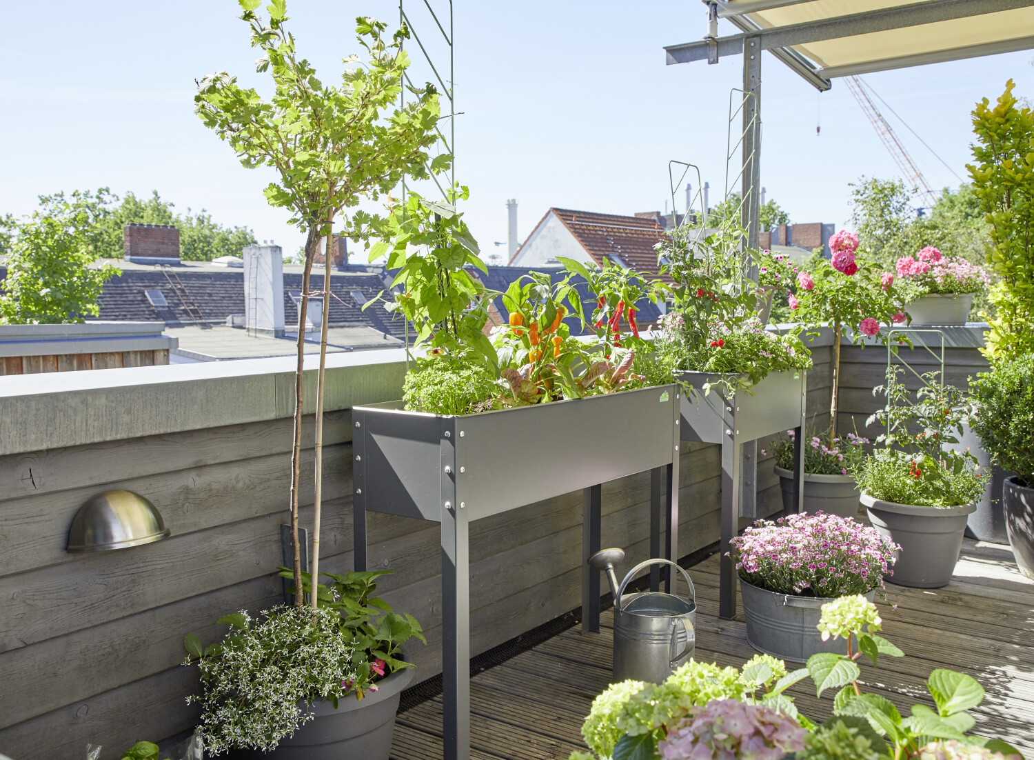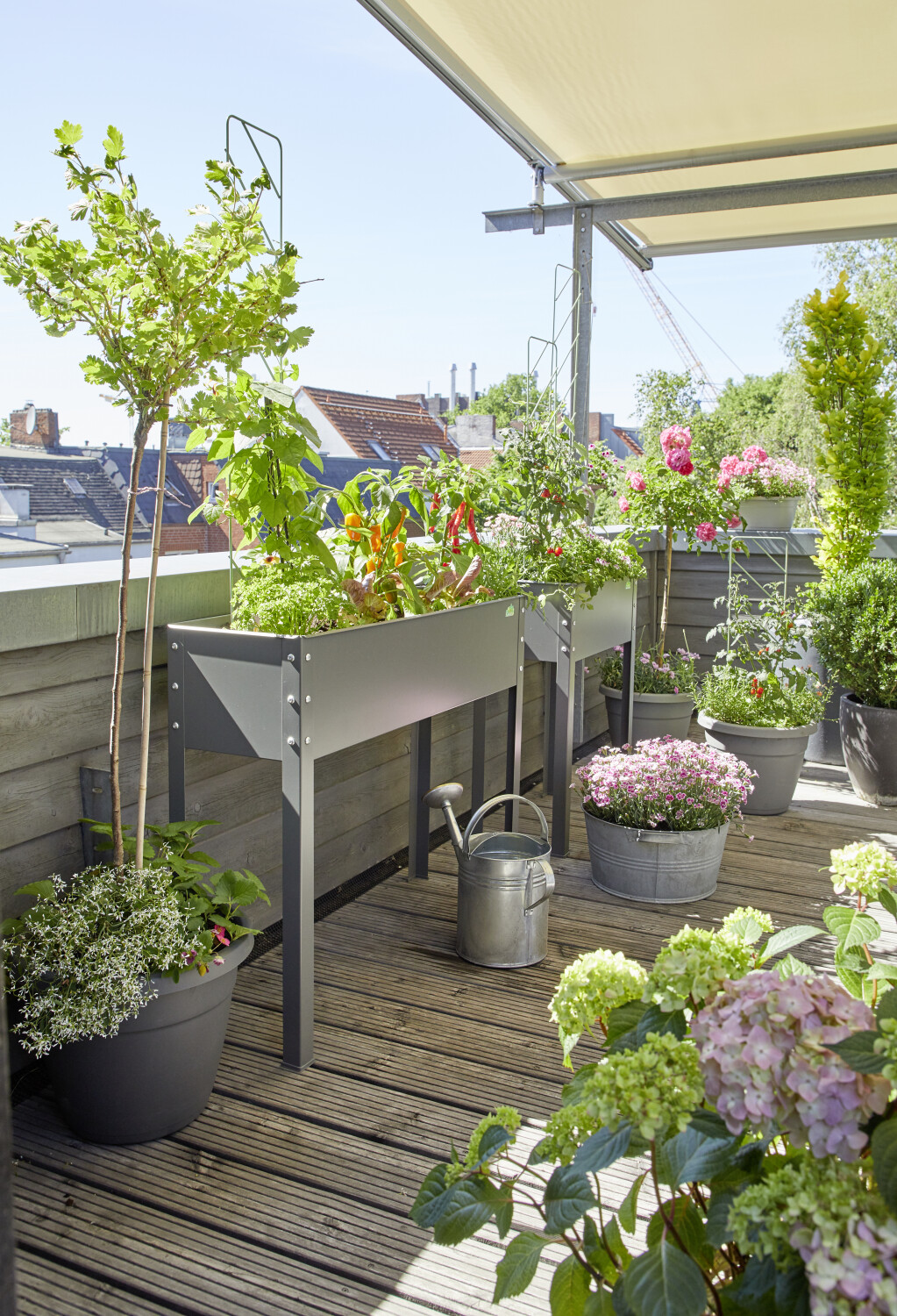 Deze verhoogde plantenbak heeft een moderne industriële look. De kweekbak is vervaardigd uit metaal en is ideaal voor op het terras of balkon. Hij zorgt voor op en top tuinplezier, zelfs met weinig ruimte! Dankzij de comfortabele werkhoogte van 80 cm kan je rugvriendelijk tuinieren.