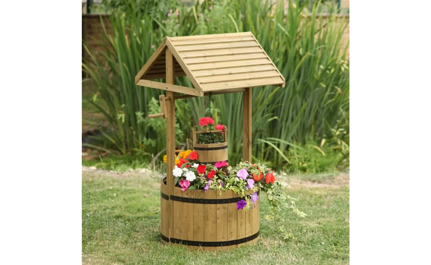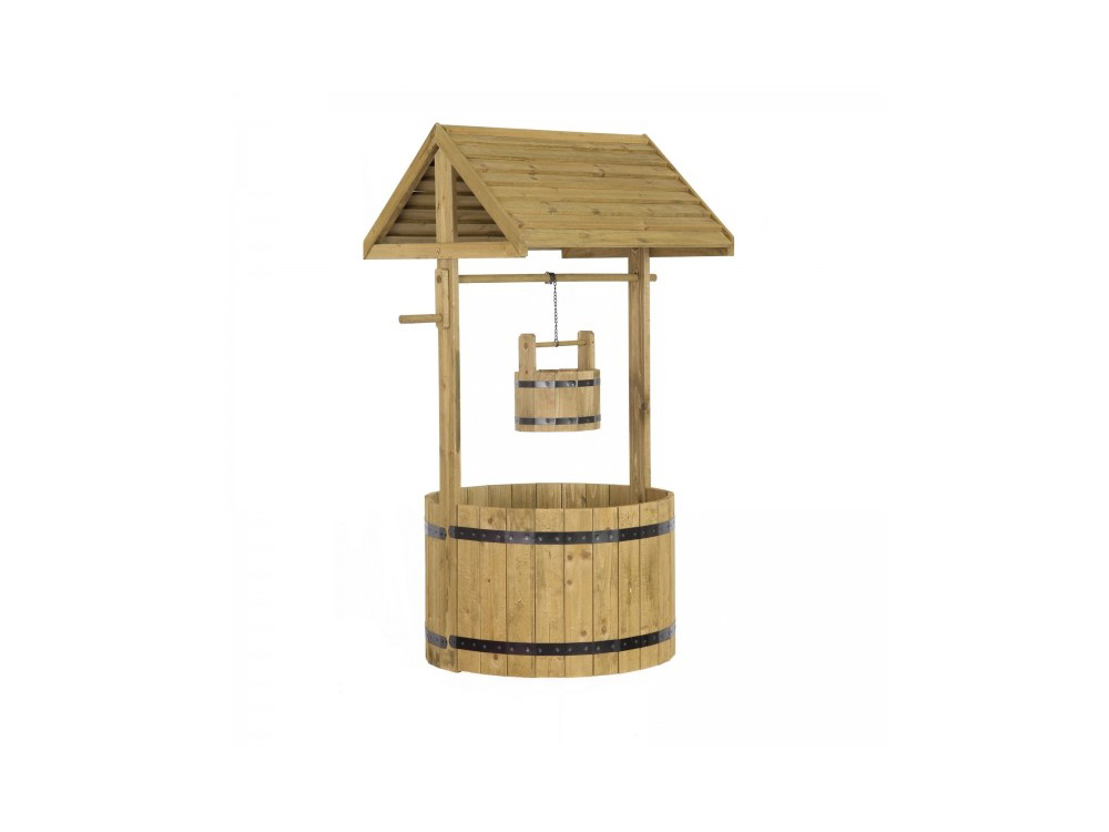 Deze extra grote plantenbak in hout spreekt tot de verbeelding. Zet deze decoratieve wensput met metalen spanbanden op een leuke plaats in de tuin en beplant zowel emmer als de waterput met kleurrijke planten.