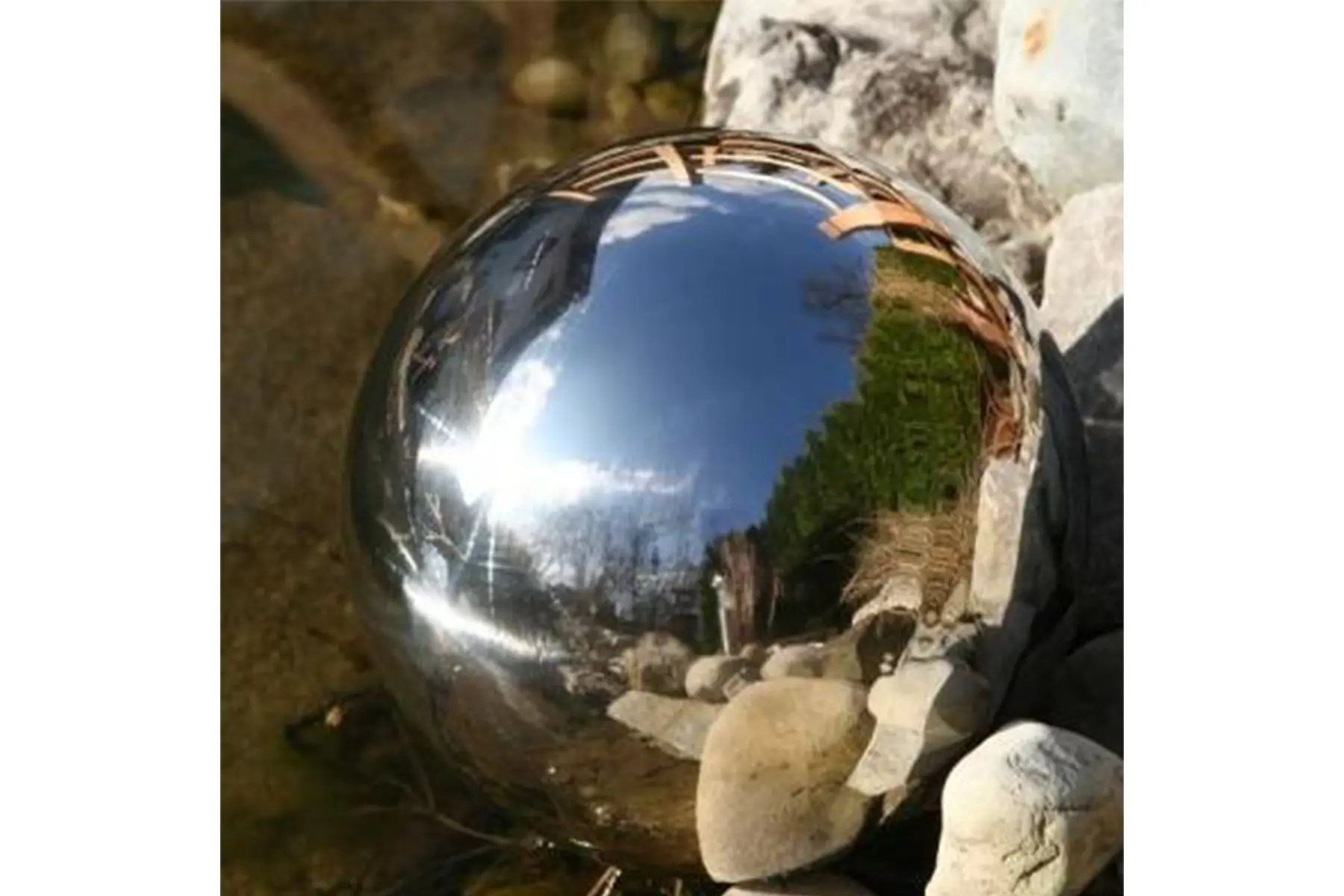 Een spiegelbol van gepolijst roestvast staal, ook wel RVS of inox genoemd, blijft kleurvast en verkleurt niet na verloop van tijd. Deze glanzende, gepolijste bol is onbreekbaar en weerbestendig, waardoor hij zowel binnen als buiten gebruikt kan worden, bijvoorbeeld bij de voordeur, in de vijver of in een boom.