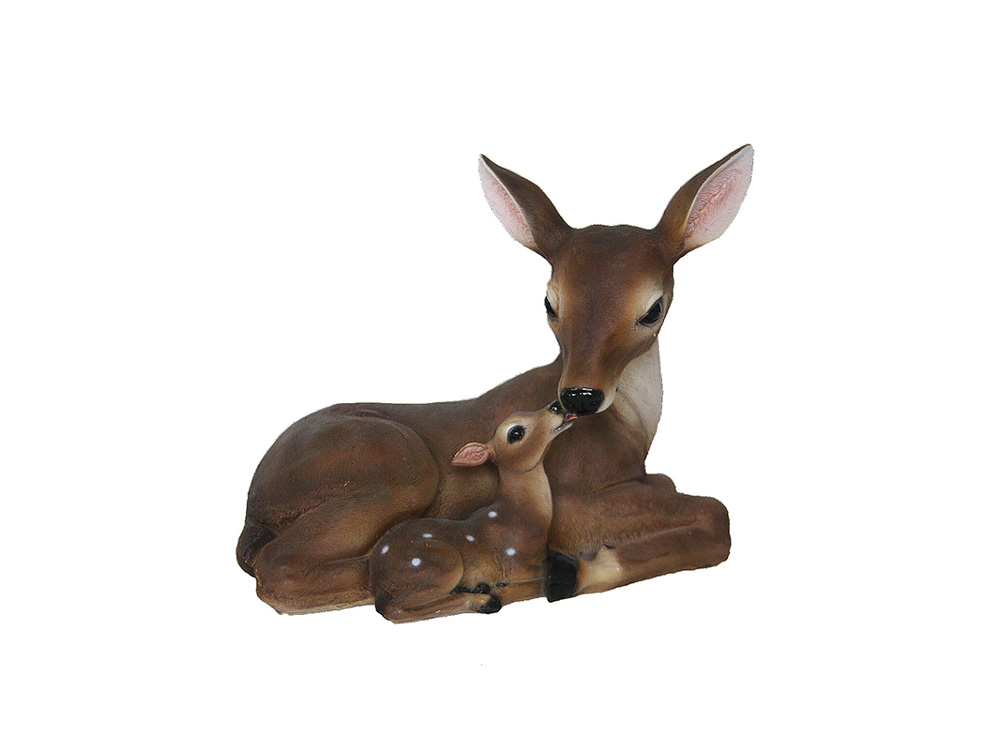 Bij dit beeld liggen de reegeit en het jong dicht tegen elkaar aan en likt het kalfje lieflijk zijn moeder.