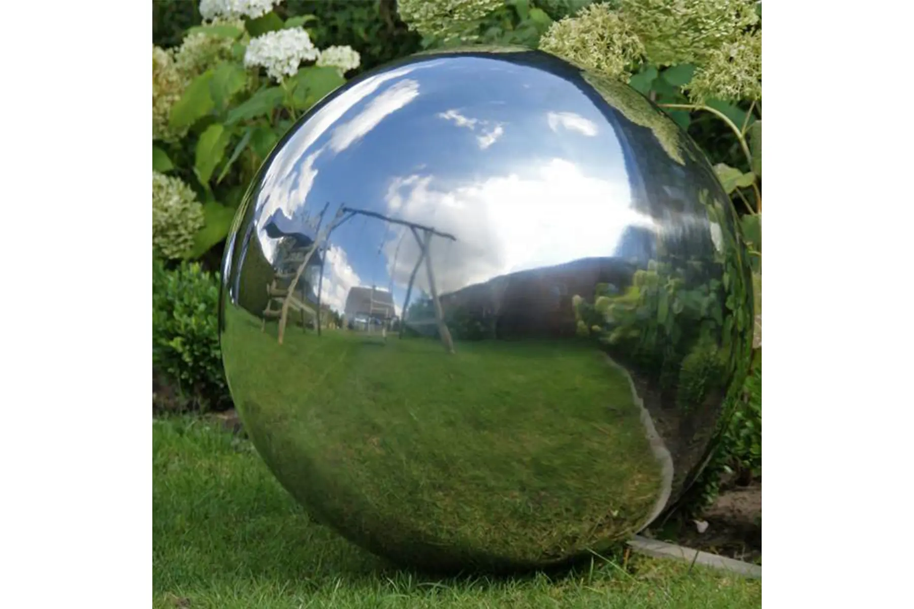 Een spiegelbol van gepolijst roestvast staal, ook wel RVS of inox genoemd, blijft kleurvast en verkleurt niet na verloop van tijd. Deze glanzende, gepolijste bol is onbreekbaar en weerbestendig, waardoor hij zowel binnen als buiten gebruikt kan worden, bijvoorbeeld bij de voordeur, in de vijver of in een boom.