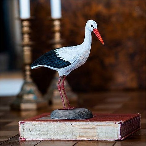 Ambachtelijk vormgegeven houten ooievaar. Deze aantrekkelijke miniatuur ooievaar is beschilderd met milieuvriendelijke verf.