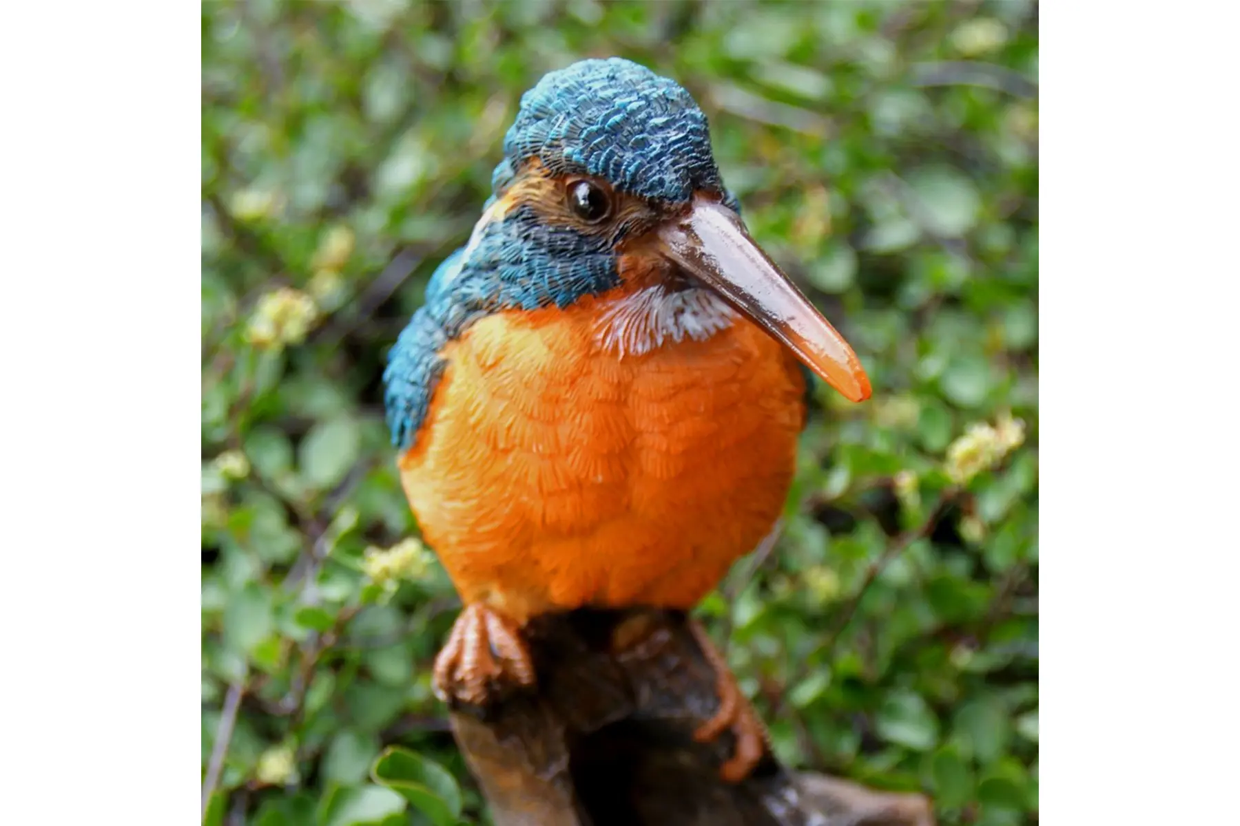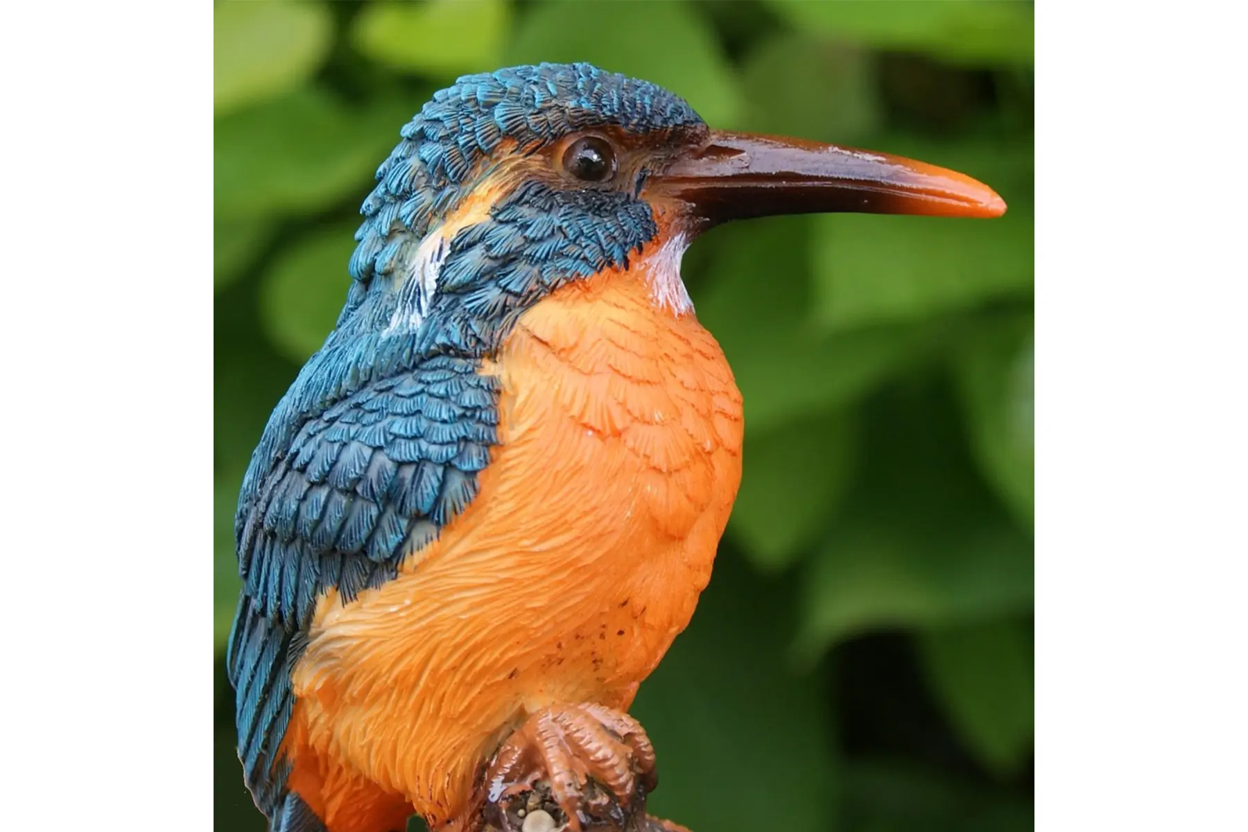 Een prachtig beeld van een ijsvogel, rustend op een tak van Esschert Design. Dit decostuk geeft duidelijk de fijne lange snavel en prachtige kleuren van de ijsvogel weer.