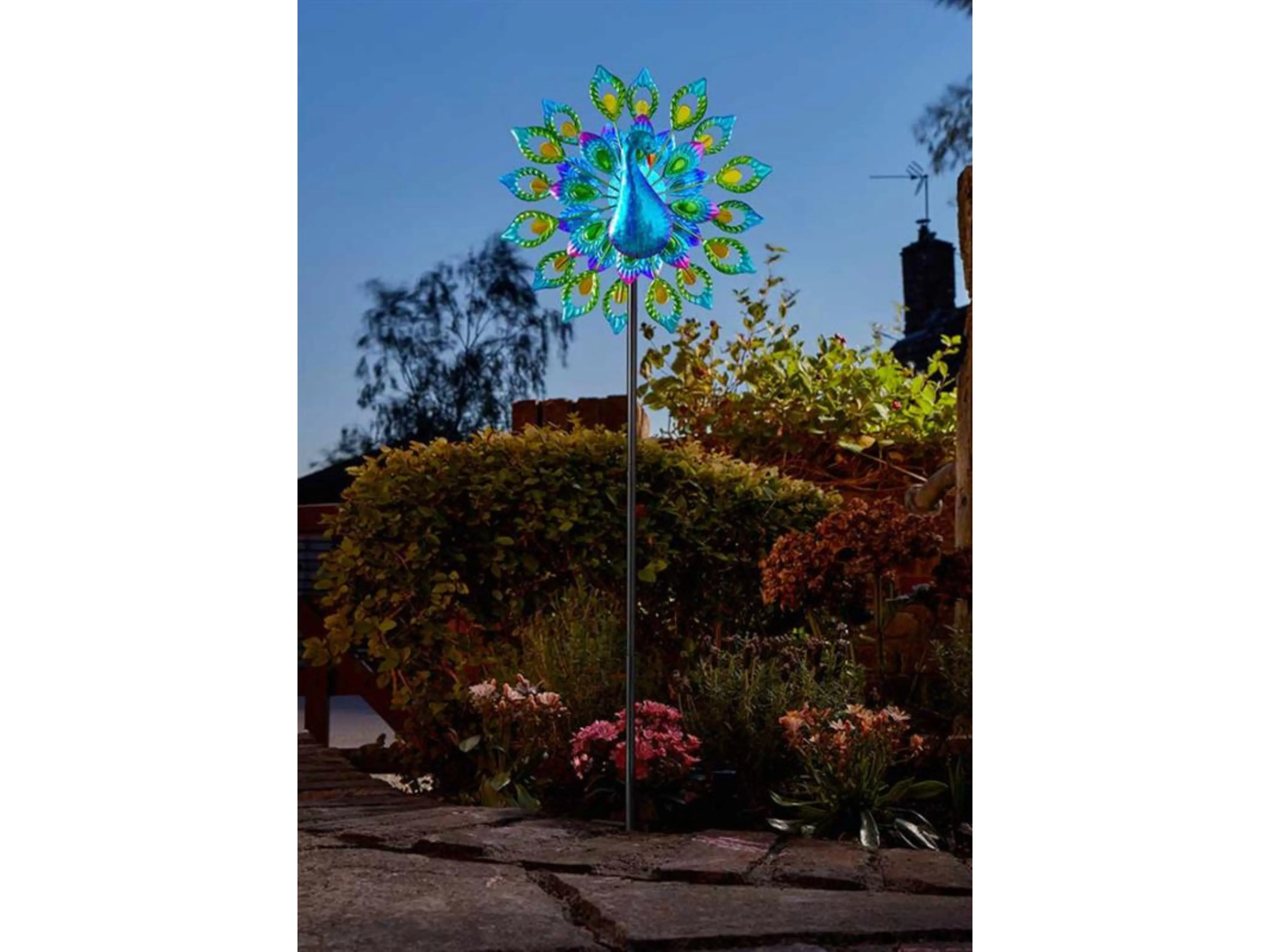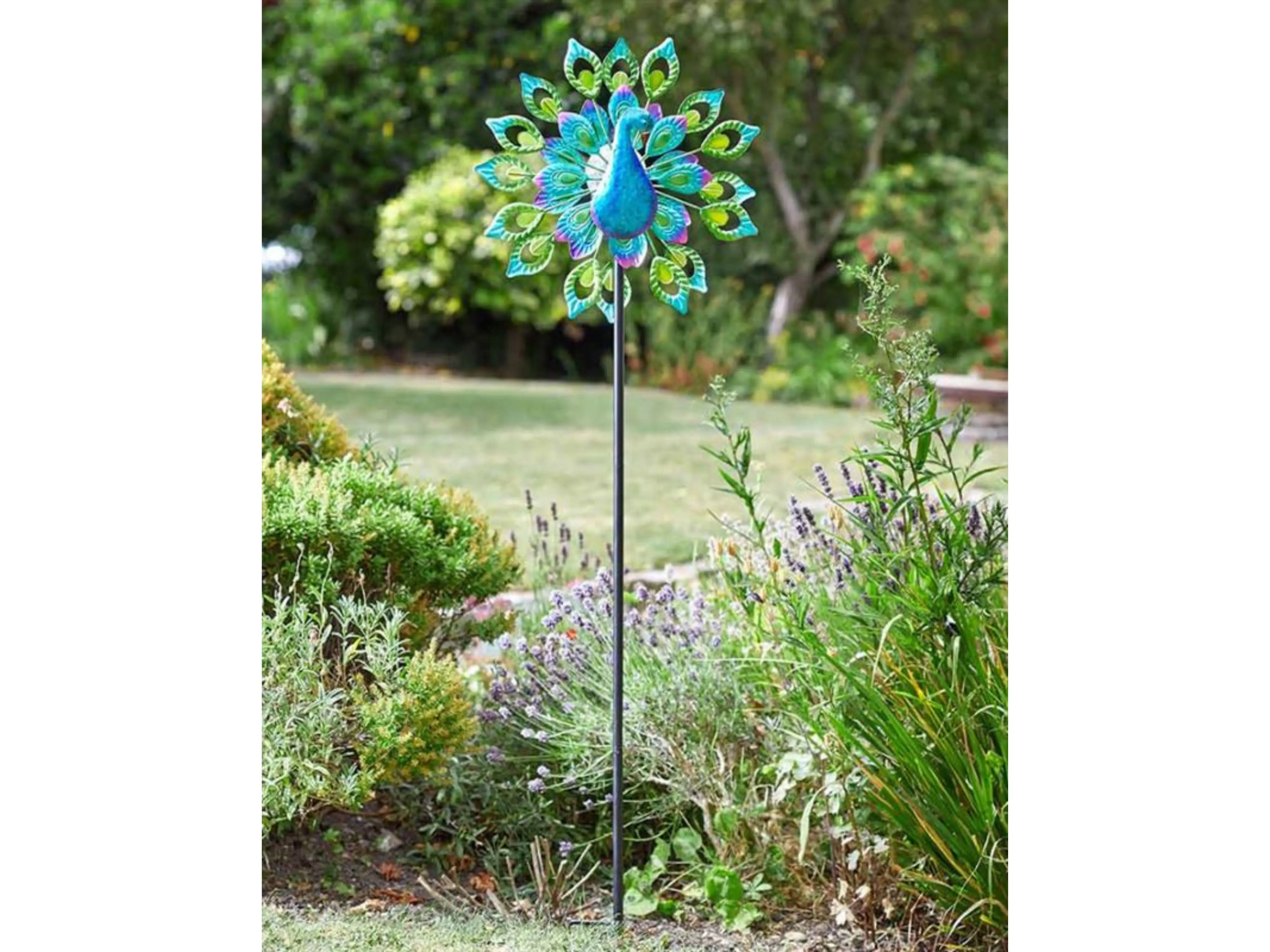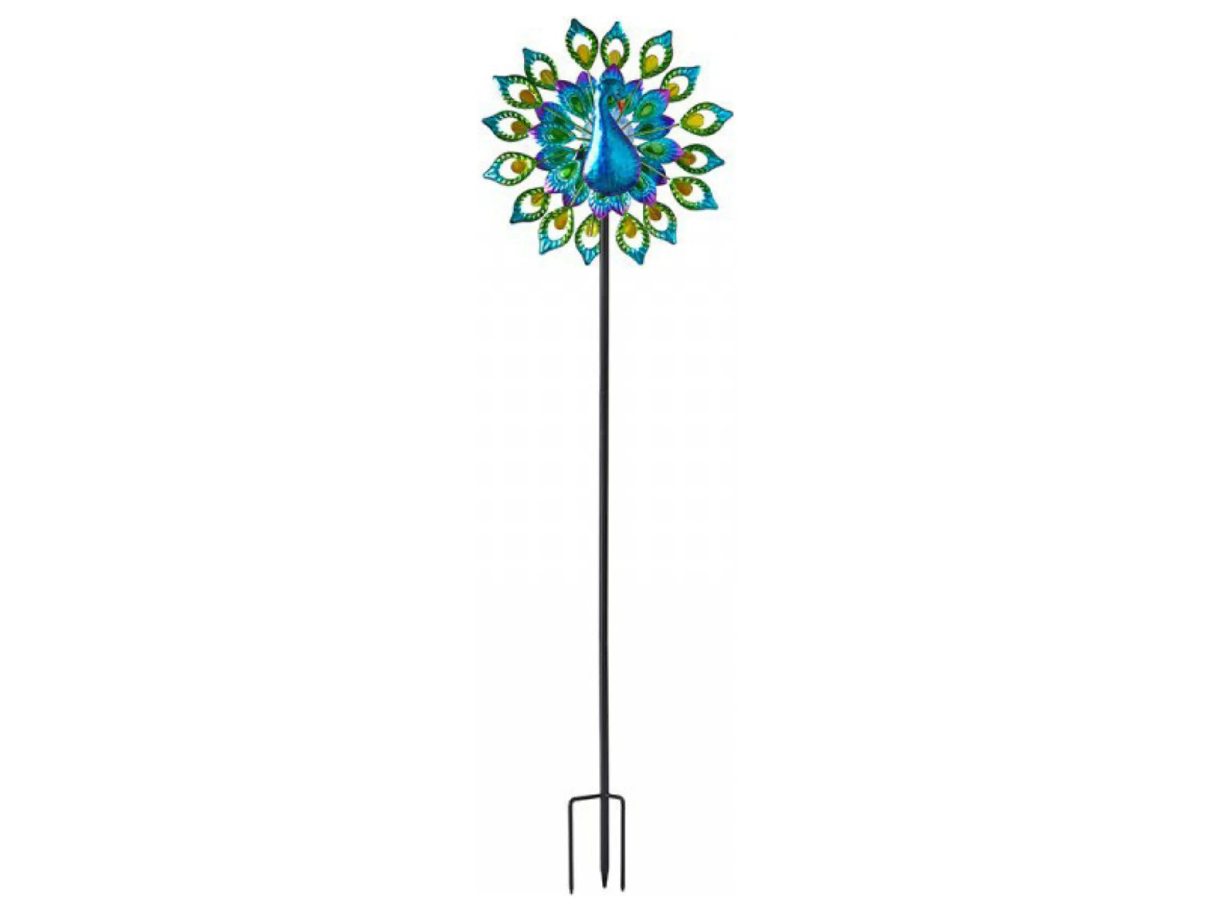Deze prachtige windspinner met pauw brengt kleur en leven in jouw tuin. Dankzij de roterende schoepen spint deze windmolen op het ritme van de wind waarbij de kleurrijke veren van de pauw voor een magisch effect zorgen.