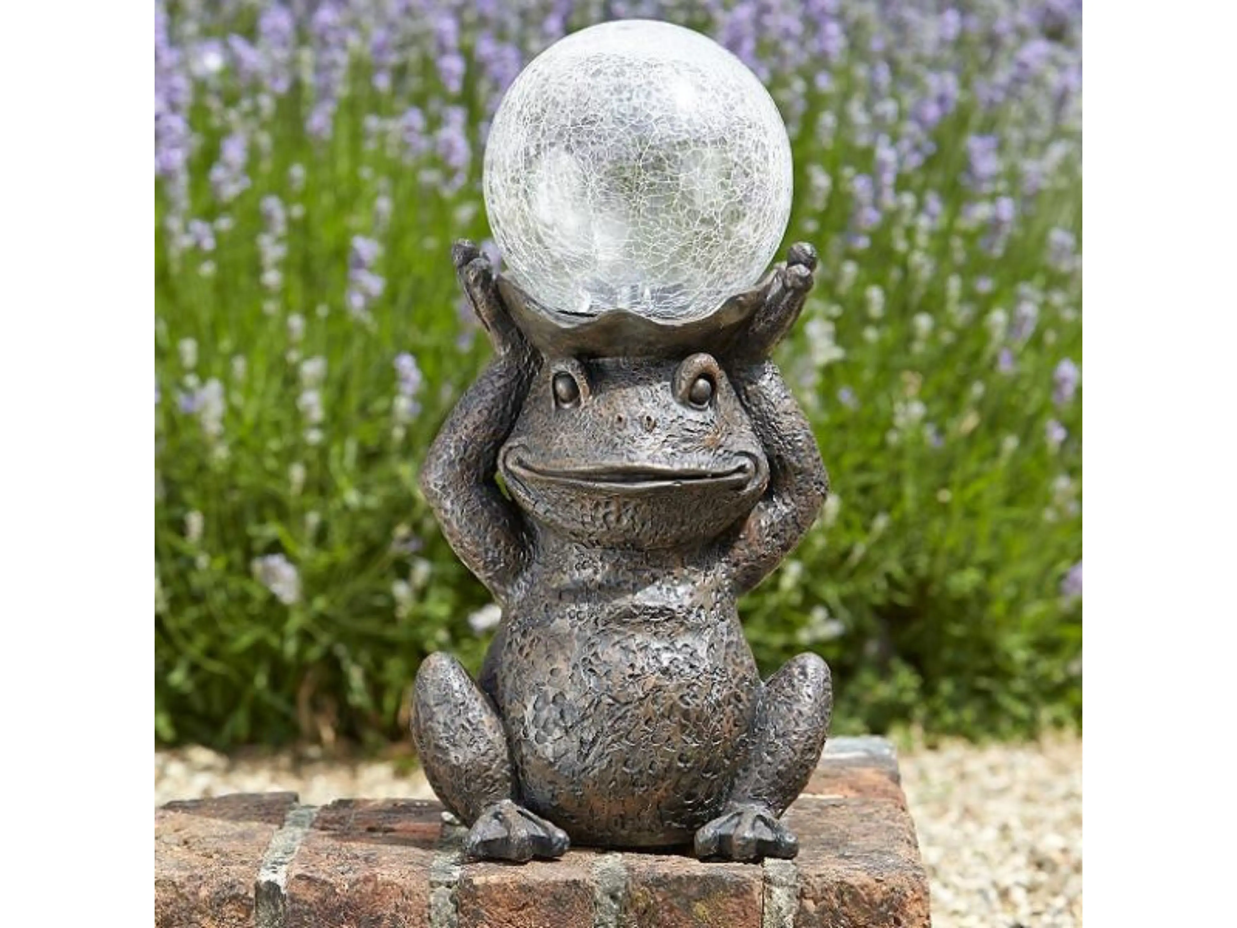 Deze lachende kikker ondersteunt een mooie lichtbol op zonne-energie. Deze tuindecoratie geeft overdag en 's avonds een charmante sfeer aan jouw terras, patio, voordeur of plantenborder. De kikker is leuk gezelschap voor groot en klein en in het duister straalt de lichtbol een feeëriek licht uit.