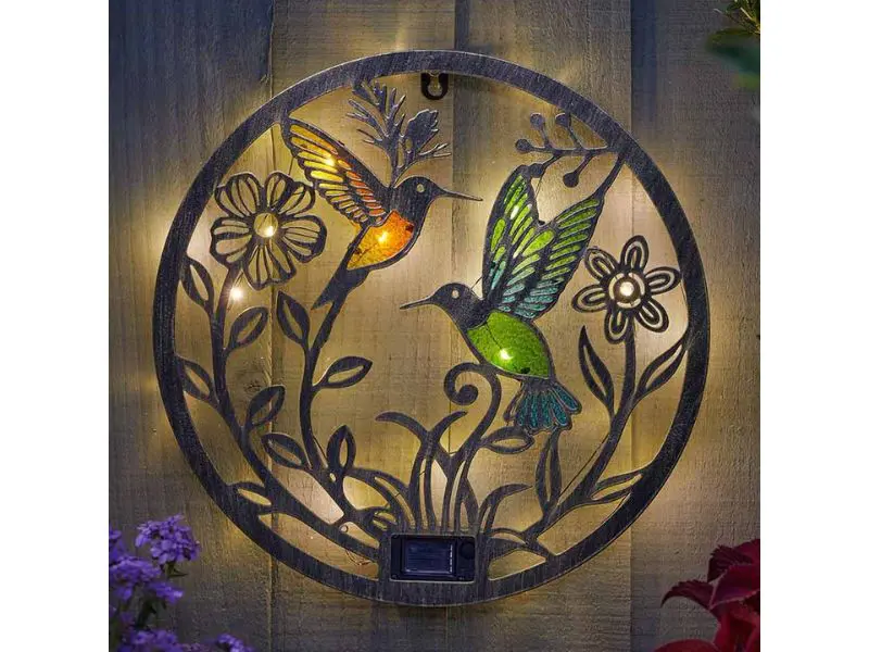 - Dit kunstwerk, met twee levendige kolibries omringd door delicate bloemmotieven, is uitgevoerd in een glas-in-loodstijl die de elegantie en schittering van de natuur vastlegt - zowel overdag als 's nachts!