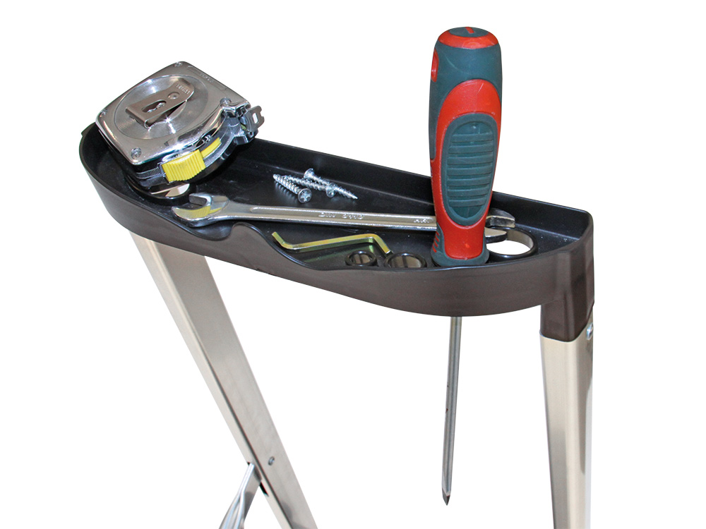 Om de grip op de treden zo lang mogelijk hoog te houden, zijn de profielen behandeld met een vuilafstotende laag. Hierdoor kan je veilig en met vertrouwen werken, zelfs onder vochtige omstandigheden. De trapladder is ook voorzien van een handige gereedschapshouder die zich bovenaan de ladder bevindt. Zo heb je altijd het benodigde gereedschap binnen handbereik.