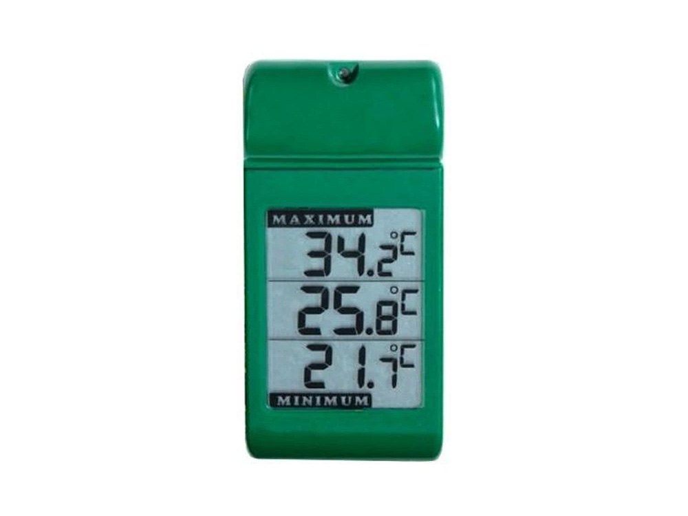Handige digitale temperatuurmeter die drie metingen weergeeft: de minimum temperatuur, de maximum temperatuur en de huidige temperatuur.