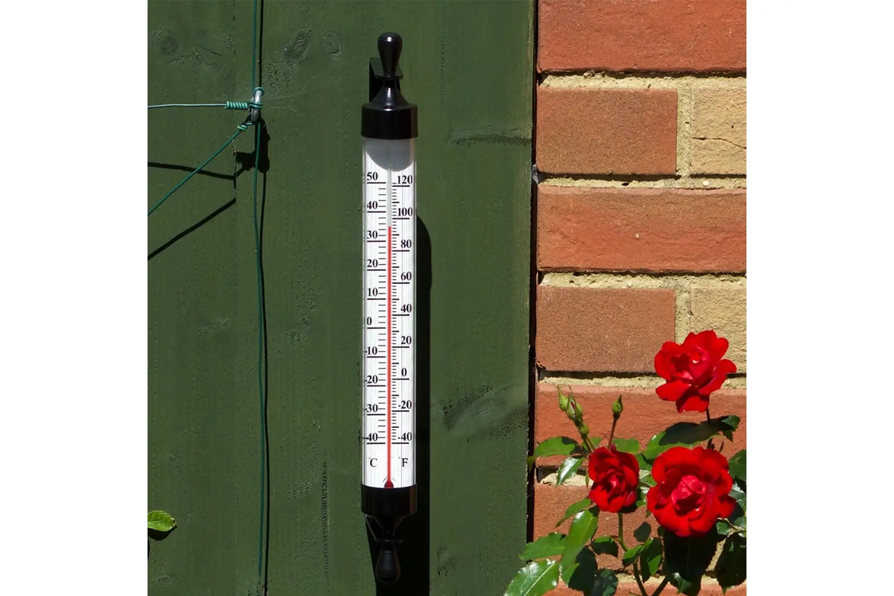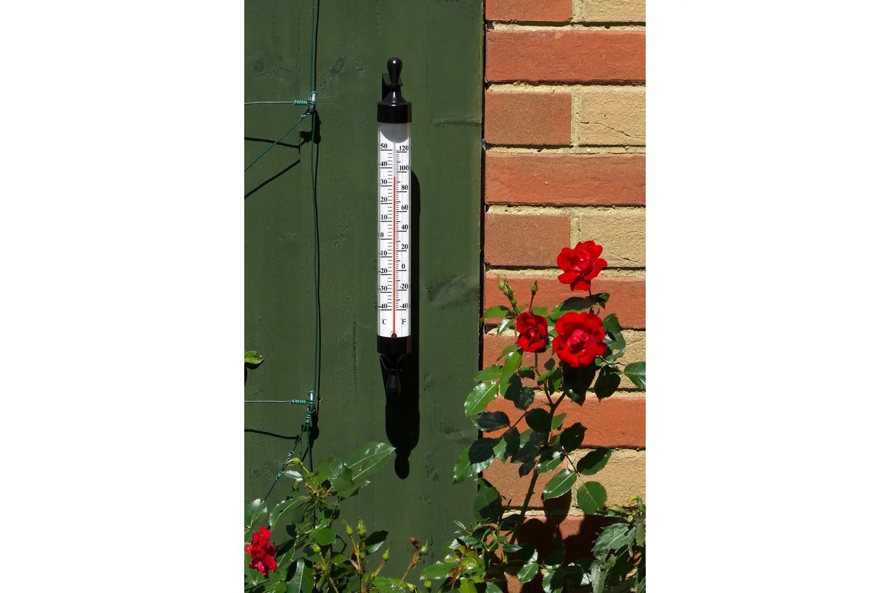 Een mooie en grote thermometer die met de bijgeleverde houder vlot aan de muur bevestigd wordt. De thermometer heeft een schaalverdeling van -40° tot + 50°, alsook een aanduiding in graden Fahrenheit van -40° tot + 120°.