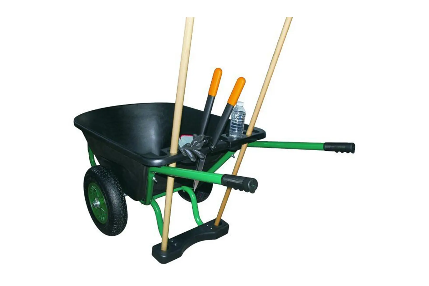 Tussen de handgrepen is er plaats om klein tuinmateriaal te bevestigen zoals een snoeischaar, handschoenen of een flesje water. Onderaan is de wagen voorzien van een houder voor gereedschap met lange steel.
