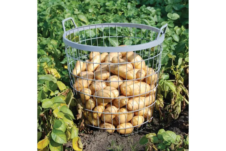 Een authentieke metalen mand, traditioneel gebruikt voor het oogsten van aardappelen, peren, appels,... Het ontwerp van de mand zorgt ervoor dat overtollige aarde erdoor kan vallen, waardoor het gewicht wordt verminderd tijdens het oogsten. Bovendien maakt de open structuur het eenvoudig om de oogst af te spoelen, omdat water en vuil gemakkelijk kunnen weglopen.