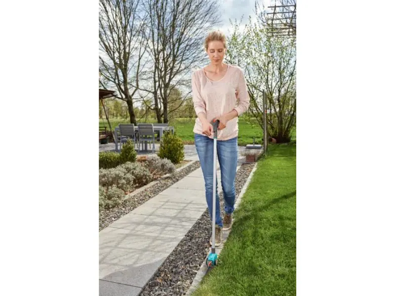 De Gardena comfort grasschaar met steel maakt het gemakkelijk en nauwkeurig knippen van grasrandjes vanuit een rechtopstaande werkhouding mogelijk. De grote, lichtlopende wielen zorgen ervoor dat de schaar eenvoudig te sturen is. Dankzij de telescopische steel kan de grasschaar eenvoudig worden aangepast aan de lengte van de gebruiker en het soort werkzaamheden. Het ergonomische handvat zorgt voor een prettige positie van de hand. De messen met antikleef coating kunnen 90 ° naar rechts en links worden gedraaid voor flexibel gebruik zodat de snijresultaten overal perfect zijn. De speciale meslager zorgt voor constant, krachtig knippen over de gehele meslengte. De grasscharen hebben een praktische eenhands veiligheidsvergrendeling voor veilige opslag. GARDENA biedt 25 jaar garantie.